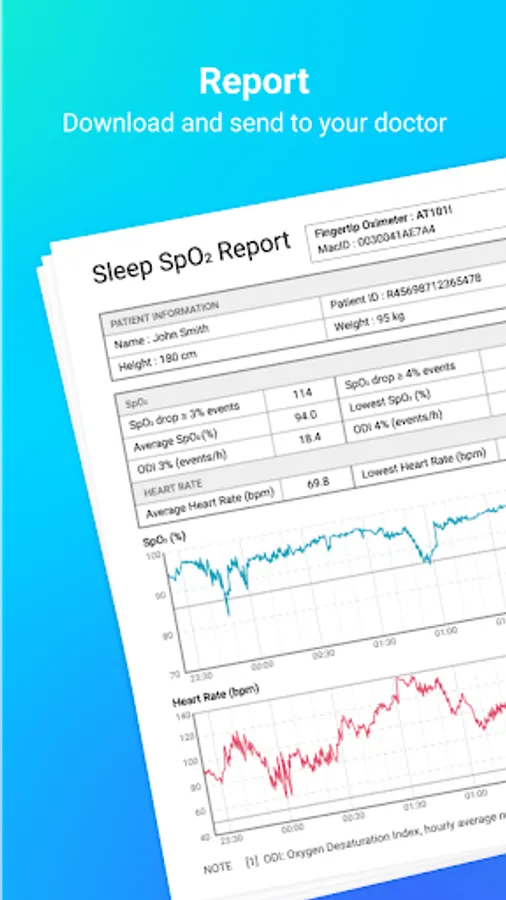 Sleep oximetry report generated by Viewtracker APP, the report will present the analysis of sleeping condition with parameters including: Lowest / average SpO2 and pulse rate, ODI 3%, ODI 4% and CT 90% sleep SpO2 concentration. Through the report, your doctor can learn whether a patient has any sleeping condition via the SpO2 and pulse trend analysis data.