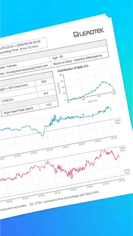 User wear Leadtek’s bluetooth fingertip pulse oximeter, pairing with ViewTracker App. It will keep recording SpO2 and pulse rate while sleeping.
