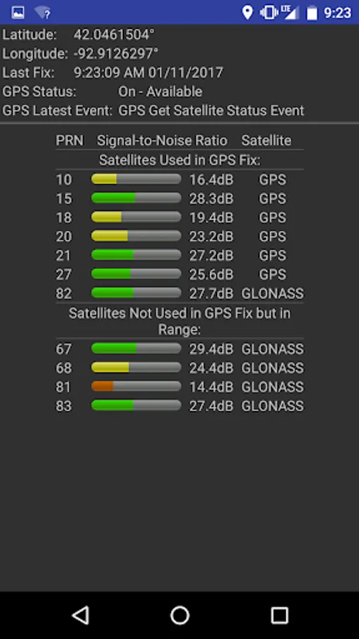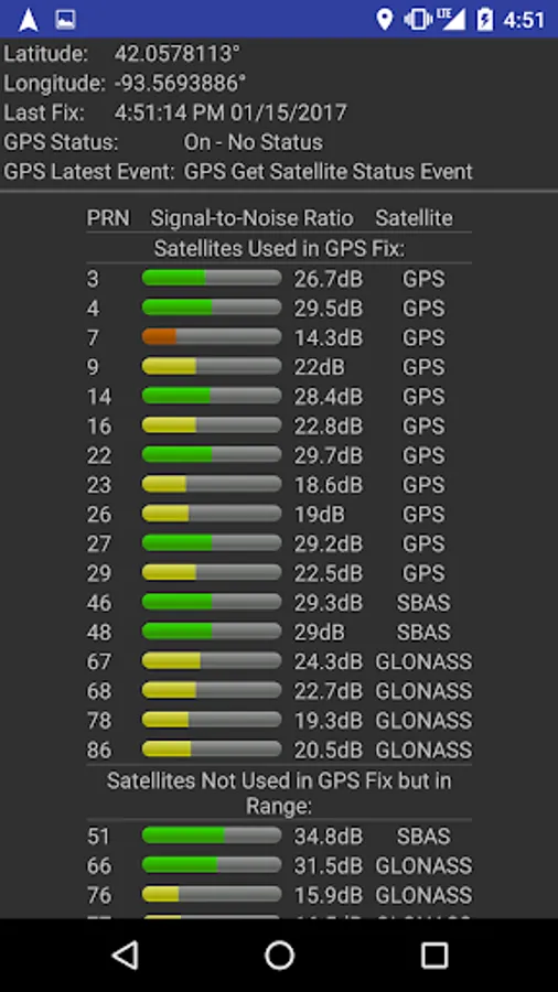 The Satellite Data View shows the satellites used in the current GPS fix along with their signal strength and type. In addition to that it also shows any other satellites that are in range.