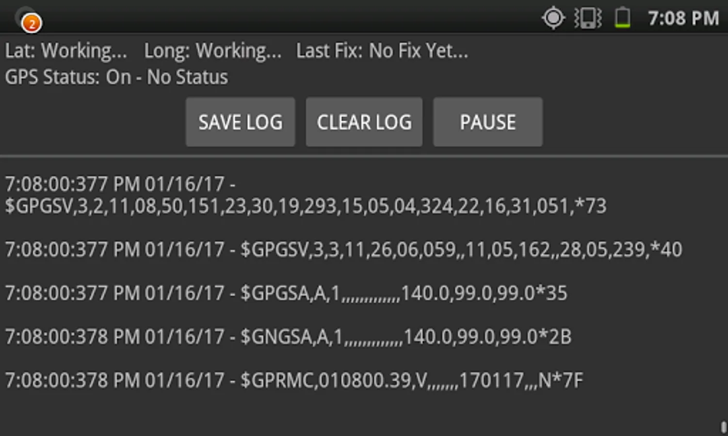 The NMEA Logger View shows all of the NMEA 0183 messages that are being received by the GPS module. It gives the option to save the log into memory that can either be looked at later or pulled off the device and onto a computer for easier viewing.
