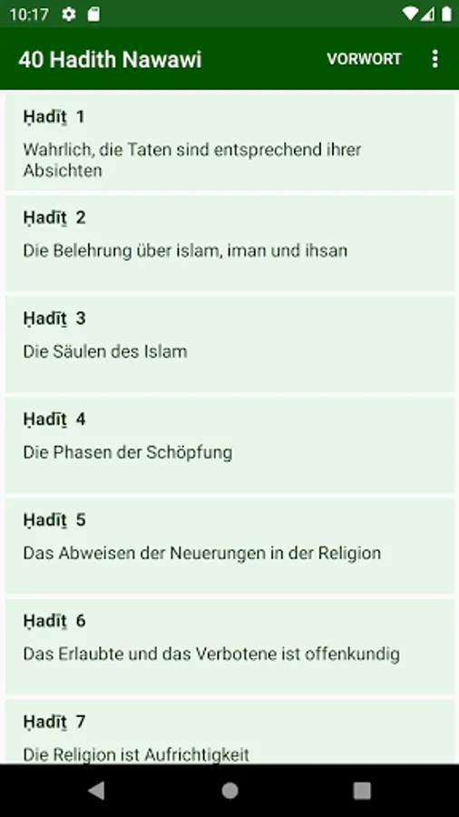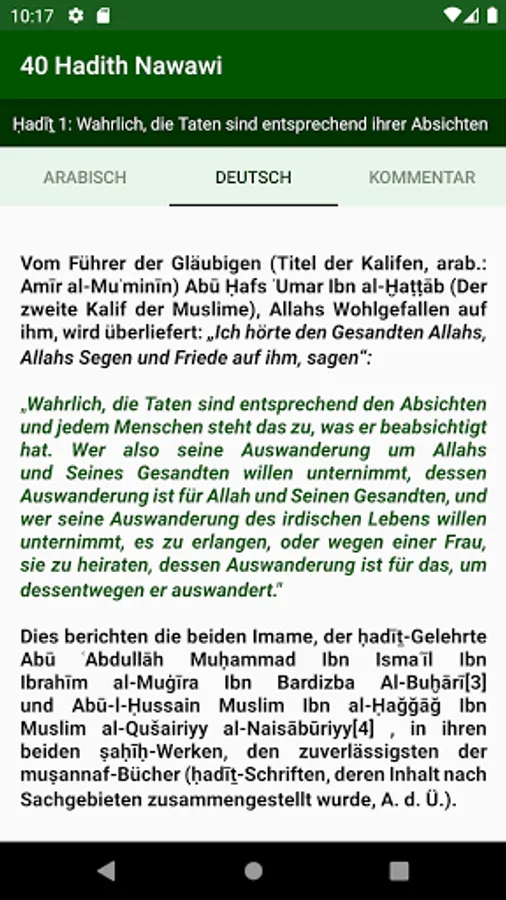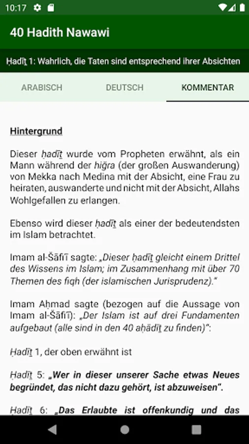 This app is taken from the book: Al-Nawawīs 40 Aḥādīṯ: Contemporary Explanation of the Forty Aḥādīṯ by Imam al-Nawawī, translated and commented by the author Samir Mustafovski. It should be a constant companion in everyday life for the Muslims, through which they learn their beautiful religion with the mobile phone. Nowadays we Muslims have all kinds of apps on the phone, but very few Islamic apps. This app is the only app in the German-speaking area that offers the 40 ḥadīṯe with explanations. At the moment, the book by the author Samir Mustafovski is the most extensive explanation of the 40 ḥadīṯe in German.