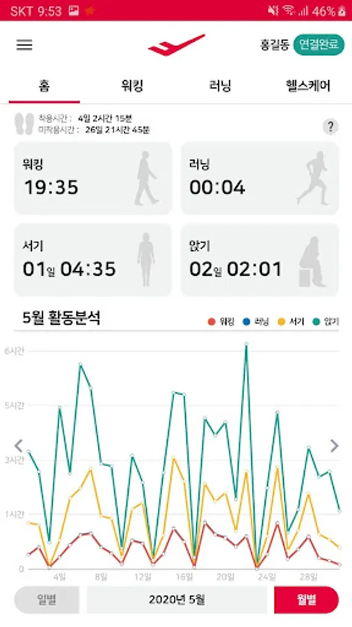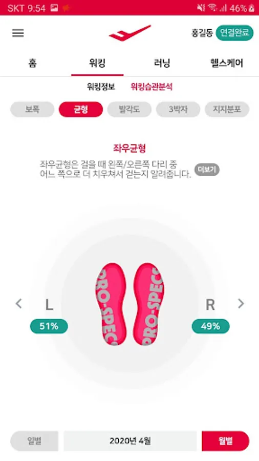In the ‘Home’ tab, it analyzes and reports the amount of activity for each type of movement while wearing the Prospect Smart Insole. You can see your daily and monthly activity patterns such as walking, running, standing, and sitting.