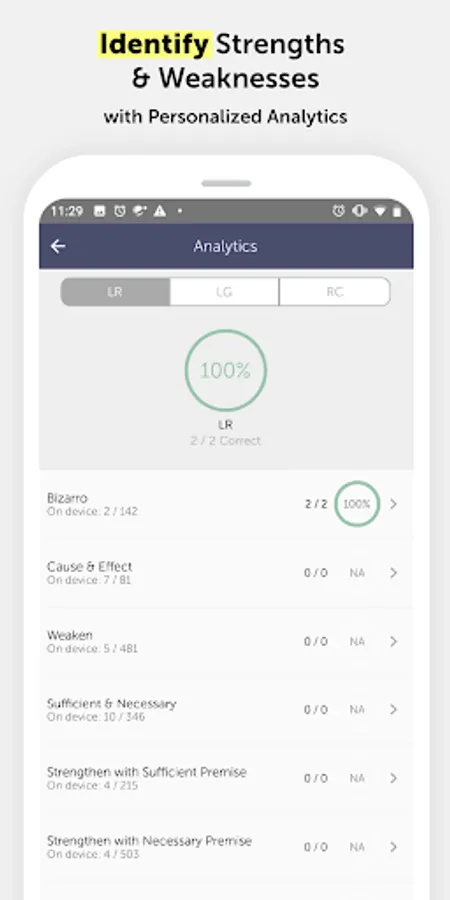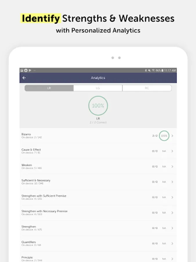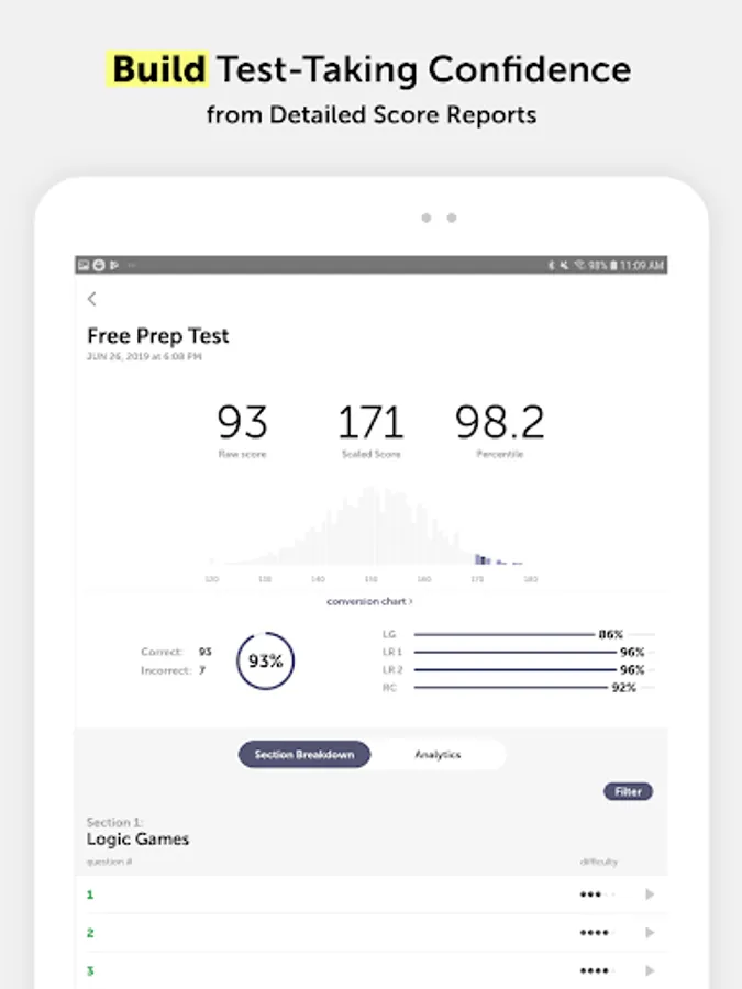 When you complete this practice LSAT (or any other Prep Test), you will receive a detailed score report with analytics highlighting your LSAT strengths and weaknesses.