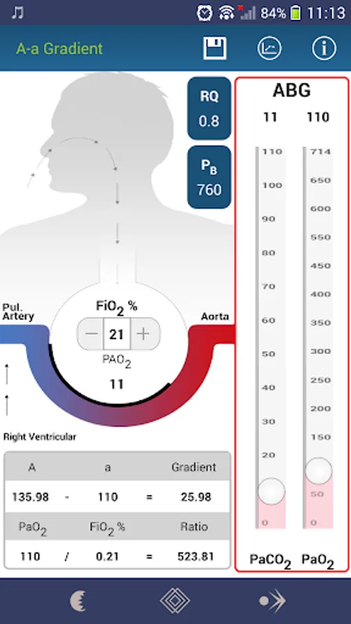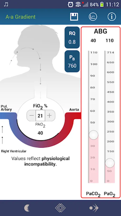 "Alveolar arterial membrane is depicted in this App. as a BLACK LINE (This is purely a conceptual representation of ventilation-perfusion relationship).The thickness of this Black Line is shown to vary depending on the variations in A-a gradient"