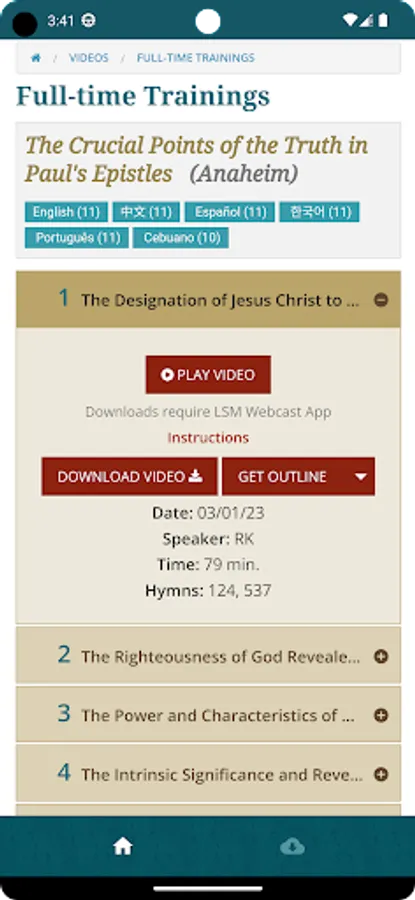 Content includes life-studies, crystallization-studies, conferences and more. Audios are $1 each and videos are free with a $9.95/month subscription. Content may be watched online or downloaded for offline viewing. This site and its contents is available in multiple languages including English, Spanish, Chinese and Korean.