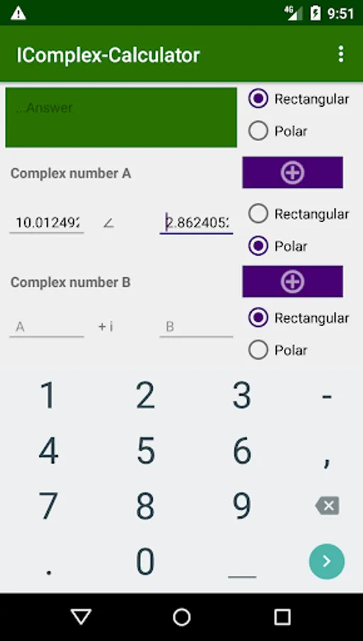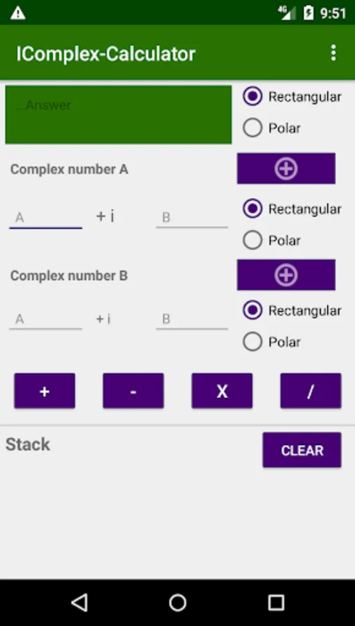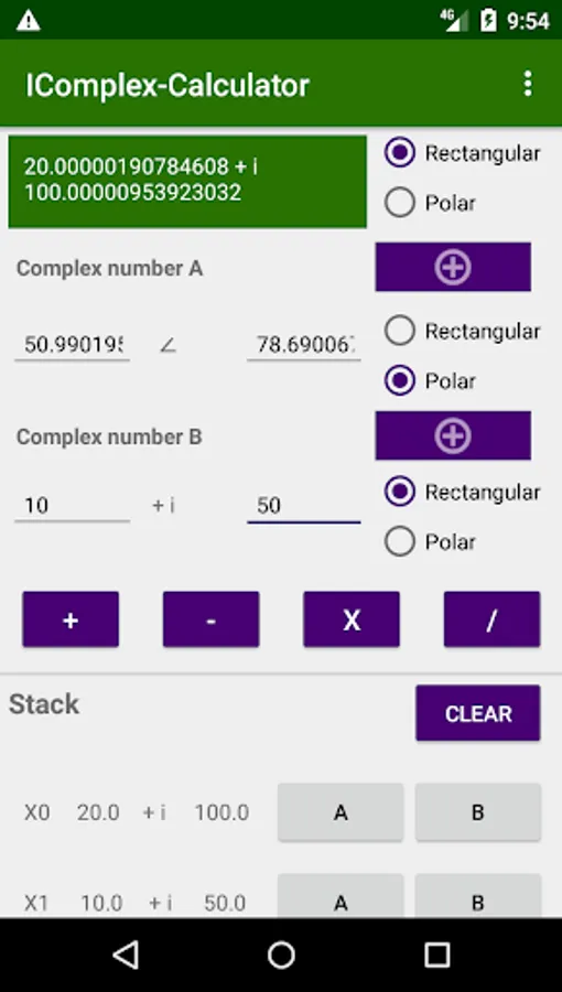 This is a complex number calculator designed to make life easier for those who need to work beyond the set of real numbers. Perform the four basic operations with complex numbers, quickly convert between rectangular and polar shapes. Use the stack to get previous results.
