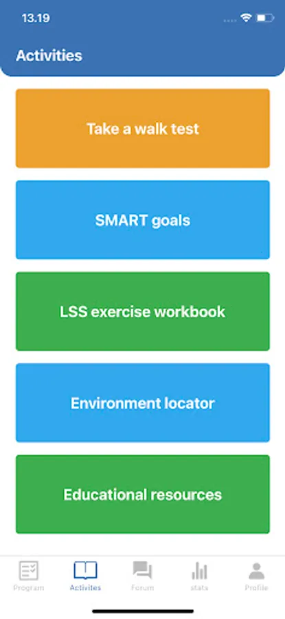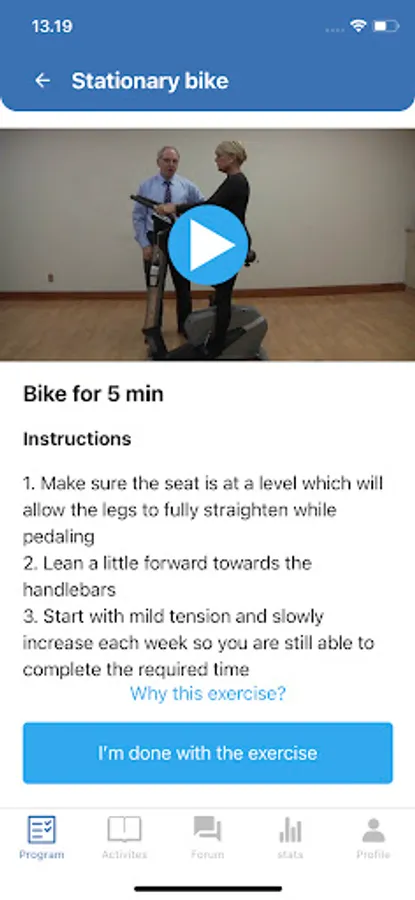 The App consists of detailed instruction on specific exercises with accompanied video demonstrations and a schedule outlining the intensity and frequency required for each exercise. There is instruction on self-management strategies aimed to reduce symptoms and maximize walking and standing ability. There is also a feature to set realistic expectations for the program and to set realistic personal goals.