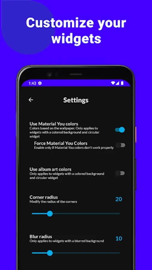 👉 On some phones with Android 12, Material Your colors is not fully implemented. In this case the colors no match with your current wallpaper. To solve this case you have the option "Force Material You colors", enable it to mimic the colors. 👈