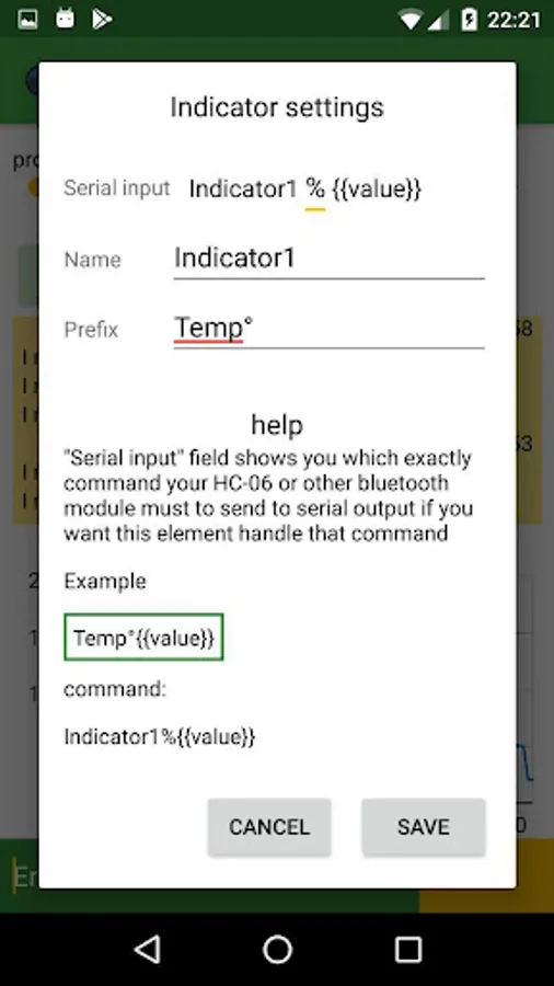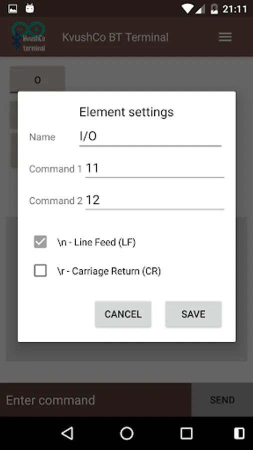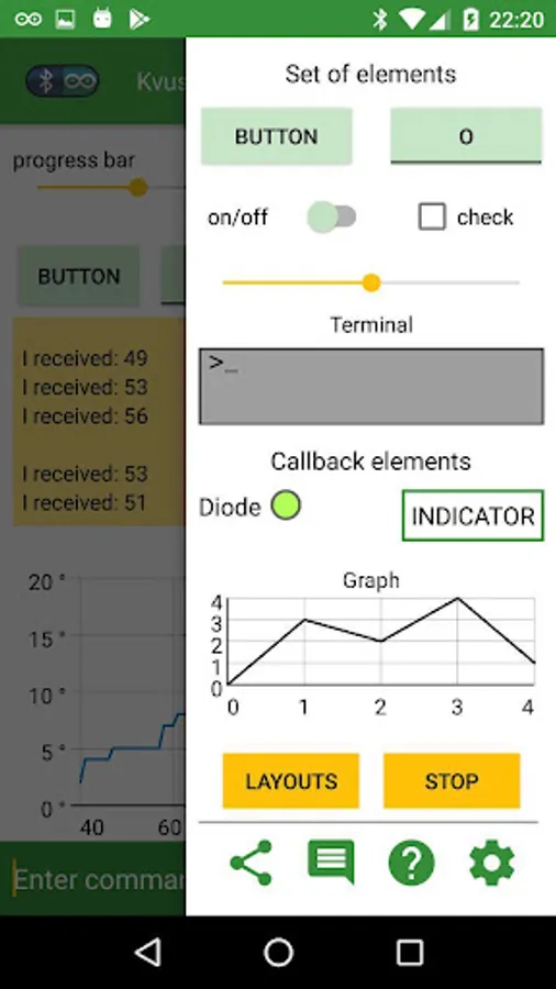 The terminal can send commands and also receive incoming commands and respond to them. For this, there are callable elements, such as LED, graph and indicator. They will handle incoming command and change their state.