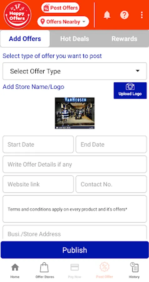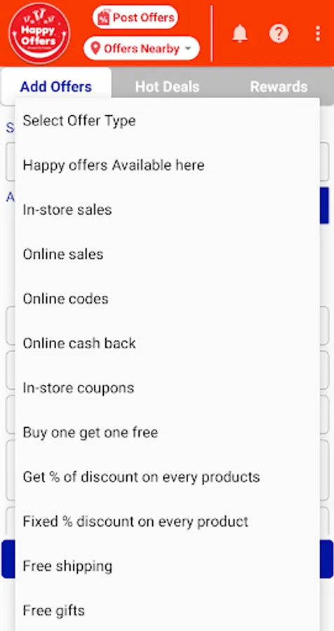 MERCHANTS: Happy Offer is an online self advertising & promotion application for SMES, showroom owners, product sellers, entrepreneur & business people. Through registration they can post offers, discounts of their products and services to inform store activities and alert the mass people about their sales drives in stores and online within a single click at cost effective way.