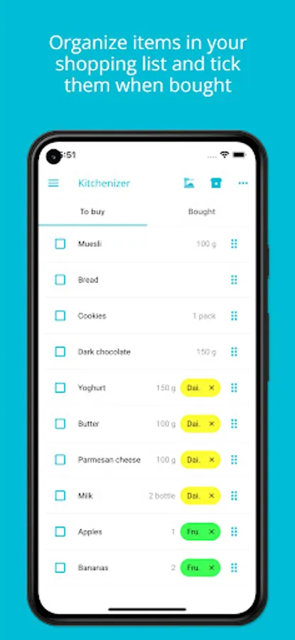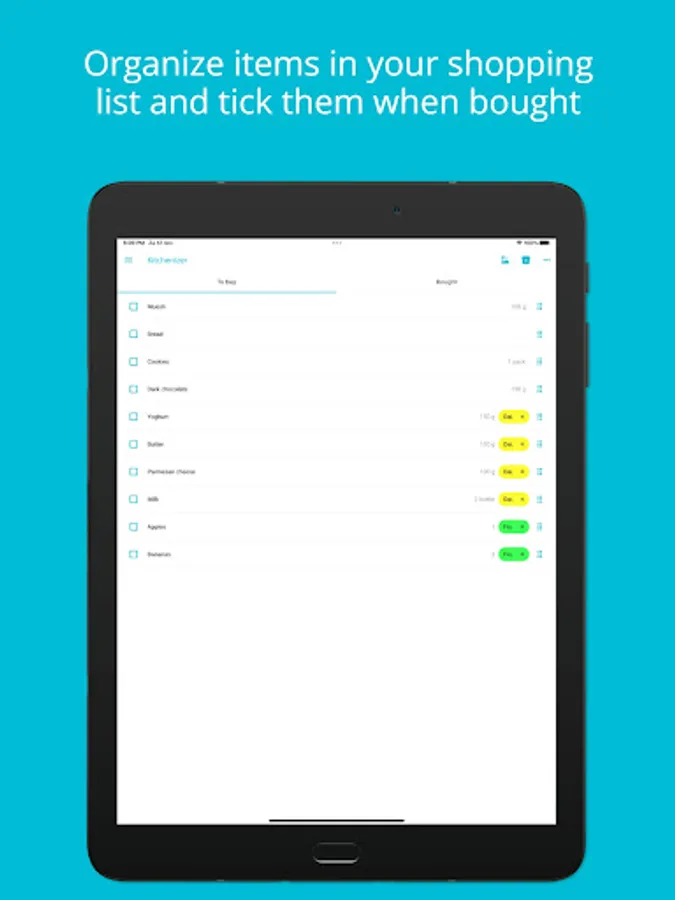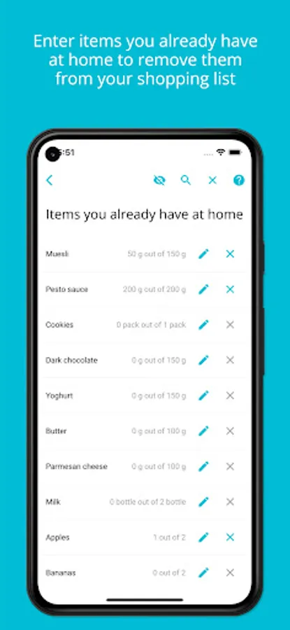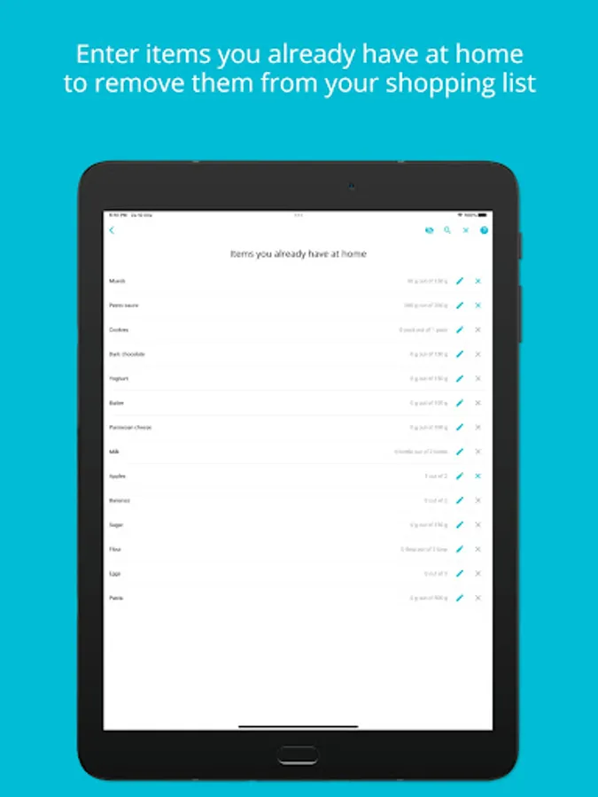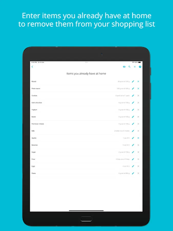 If you happen to already have a few items at home, you can enter them in the app so that they don't appear in your shopping list.