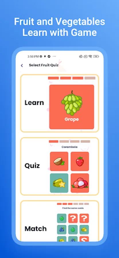 Learning fruits and vegetables is easy by playing with Fruido. First learn the fruits with sound cards. Then you can find the fruit or vegetable related to the puzzle and matching exercises. Thus, you can learn fruits and vegetables with visual cards.
