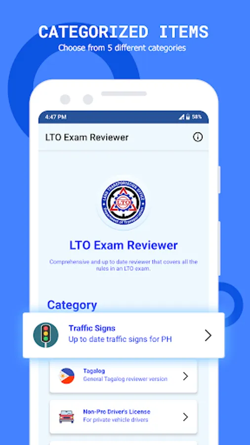 LTO Exam Reviewer app is designed to help users prepare and pass their application for driver license exam in any LTO branches nationwide. All the answers and questions are based from lto portal exam.