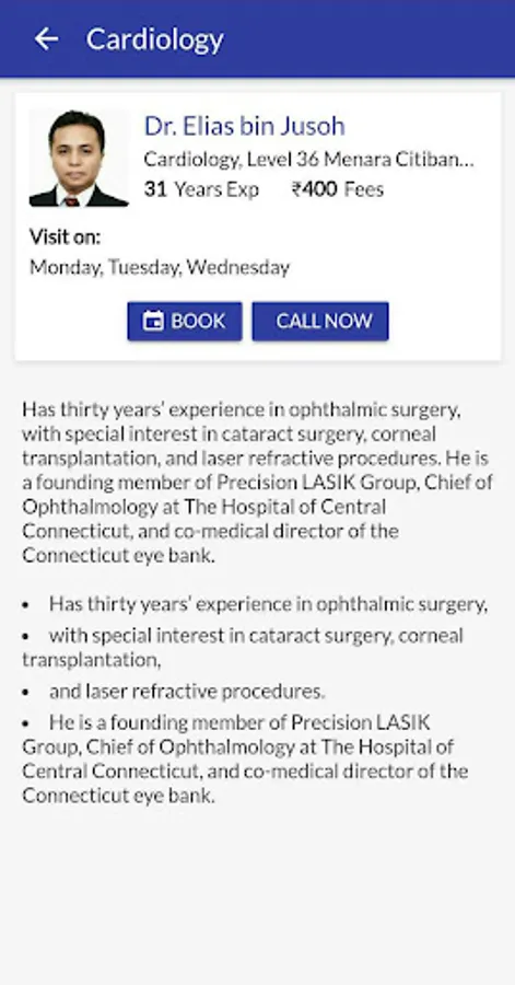 Doctor’s Details page shows entire details of the doctor with availability time, fees, experience, education qualification, expertise details of the doctors.