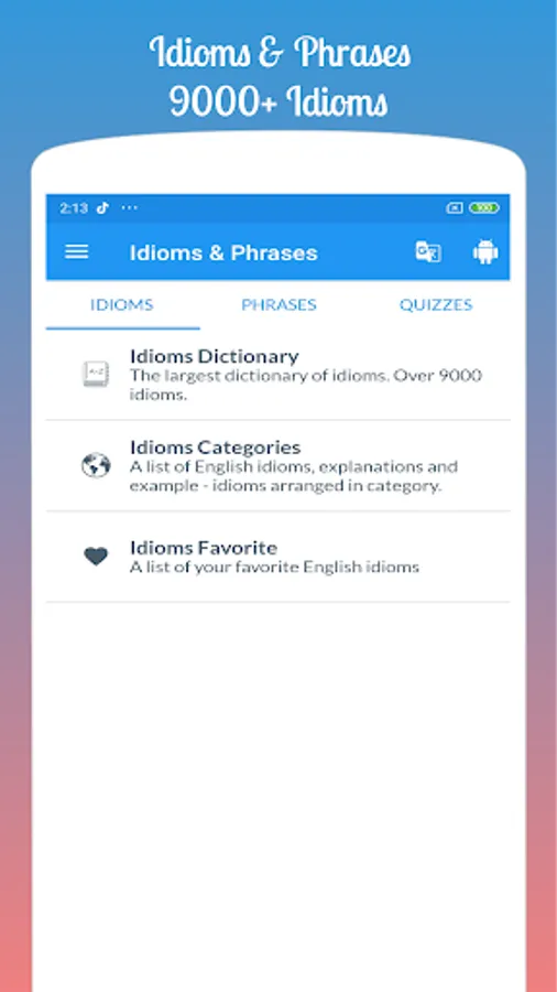 This is helpful app to you can learn Idioms , Phrases and Proverbs in English very easily and effectively.