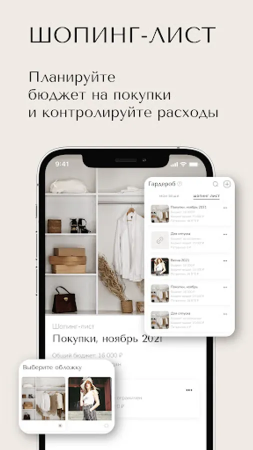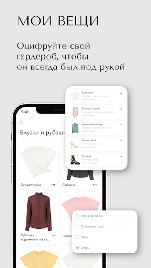 Upload up to 10 items to your digital wardrobe. Add an unlimited number of items from the catalog of basic things. Choose items that are similar to yours. Search for clothes using predefined filters, organize things by season and category.