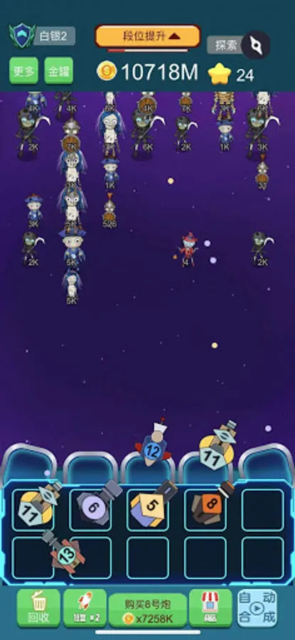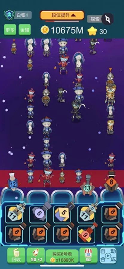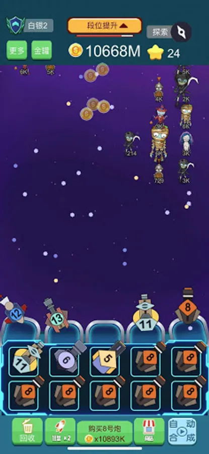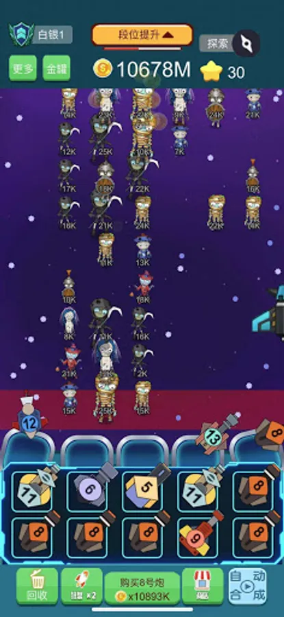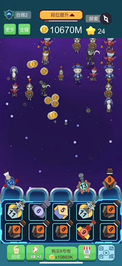 This is a mini tower defense game. By purchasing mechas to attack the enemy, the destroyed enemies will spread a lot of gold coins. Buy more mechas through gold coins. The mechas can be combined and upgraded. The higher the level of mechas, the more powerful they are. The bigger, the higher the gold coins you get!