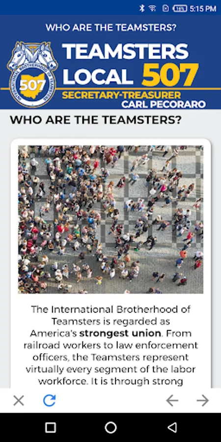 Teamsters Local 507 mobile app is designed specifically for our members to keep them informed and engaged in their Union. The app provides up to date notifications, general news and content, contact information, specific contract updates, and more!