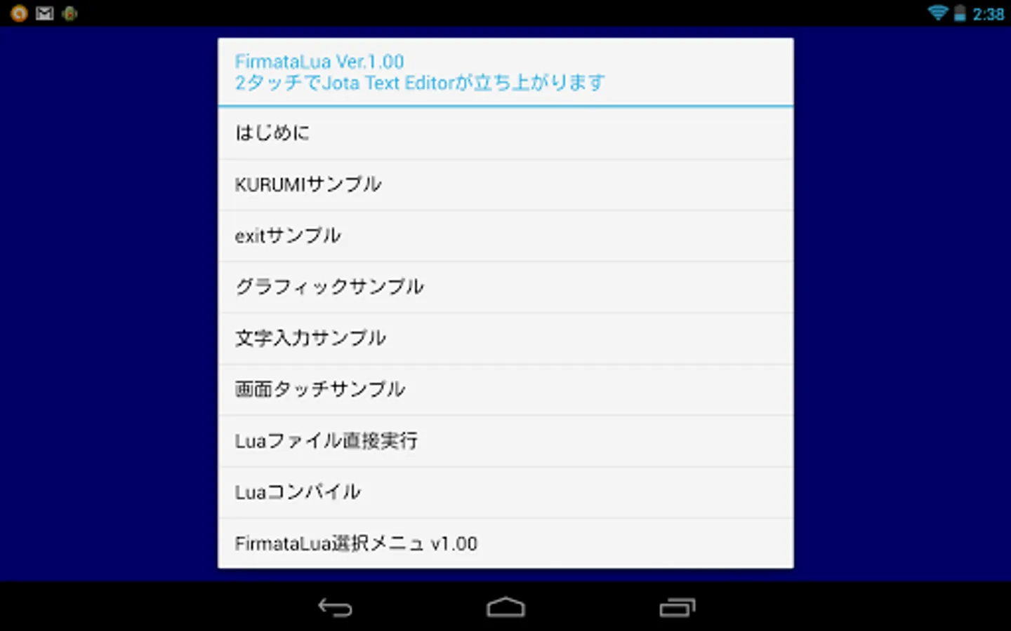 Firmatalua.lua that exists in the FirmataLua folder of the SD card is the main menu program. This is a selection menu in the script.