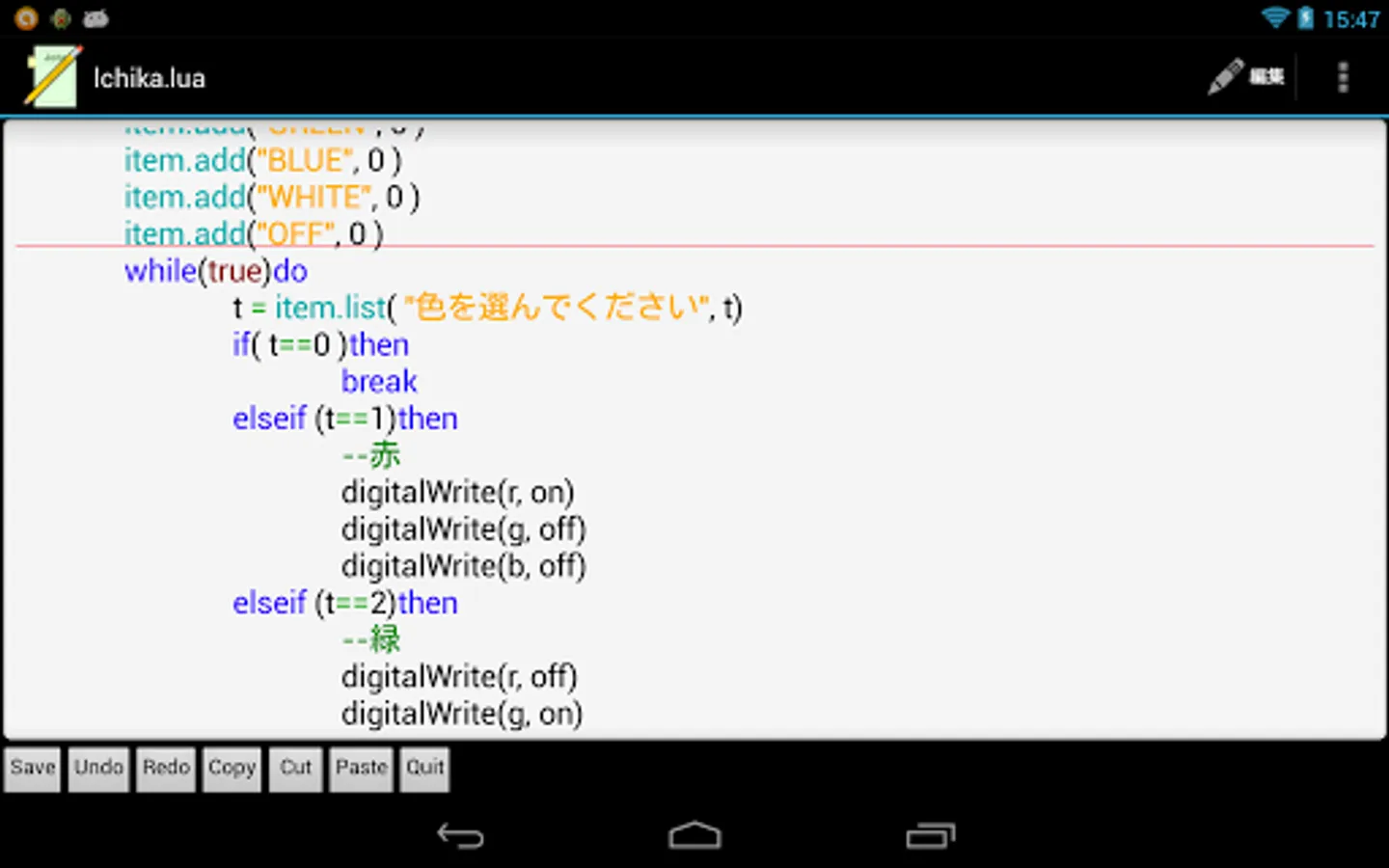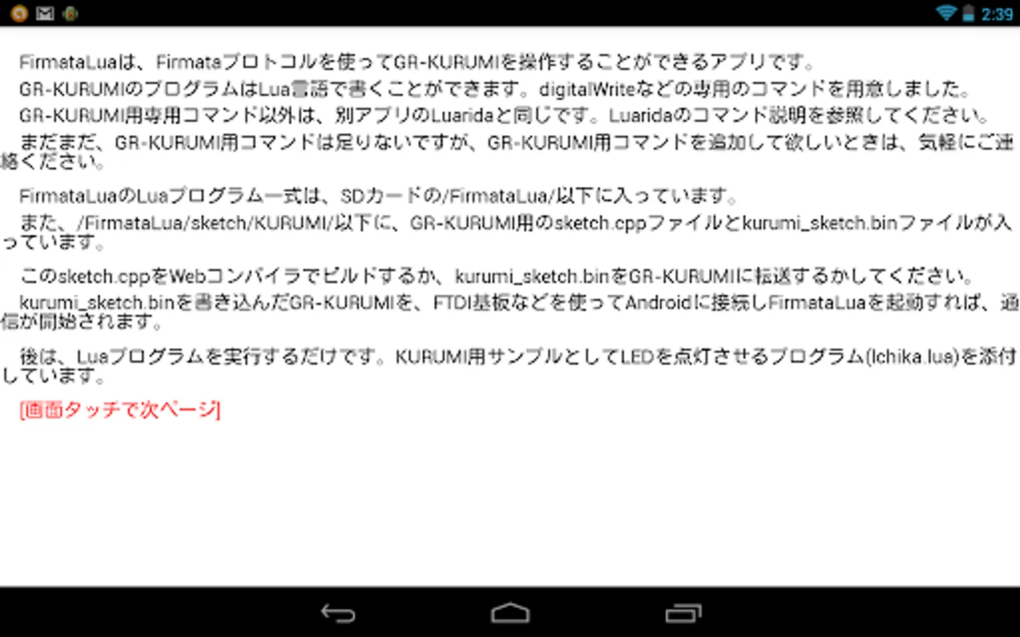If GR-KURUMI that writes kurumi_sketch.bin is connected with Android by using the FTDI substrate etc. and FirmataLua is started, the communication is begun.
