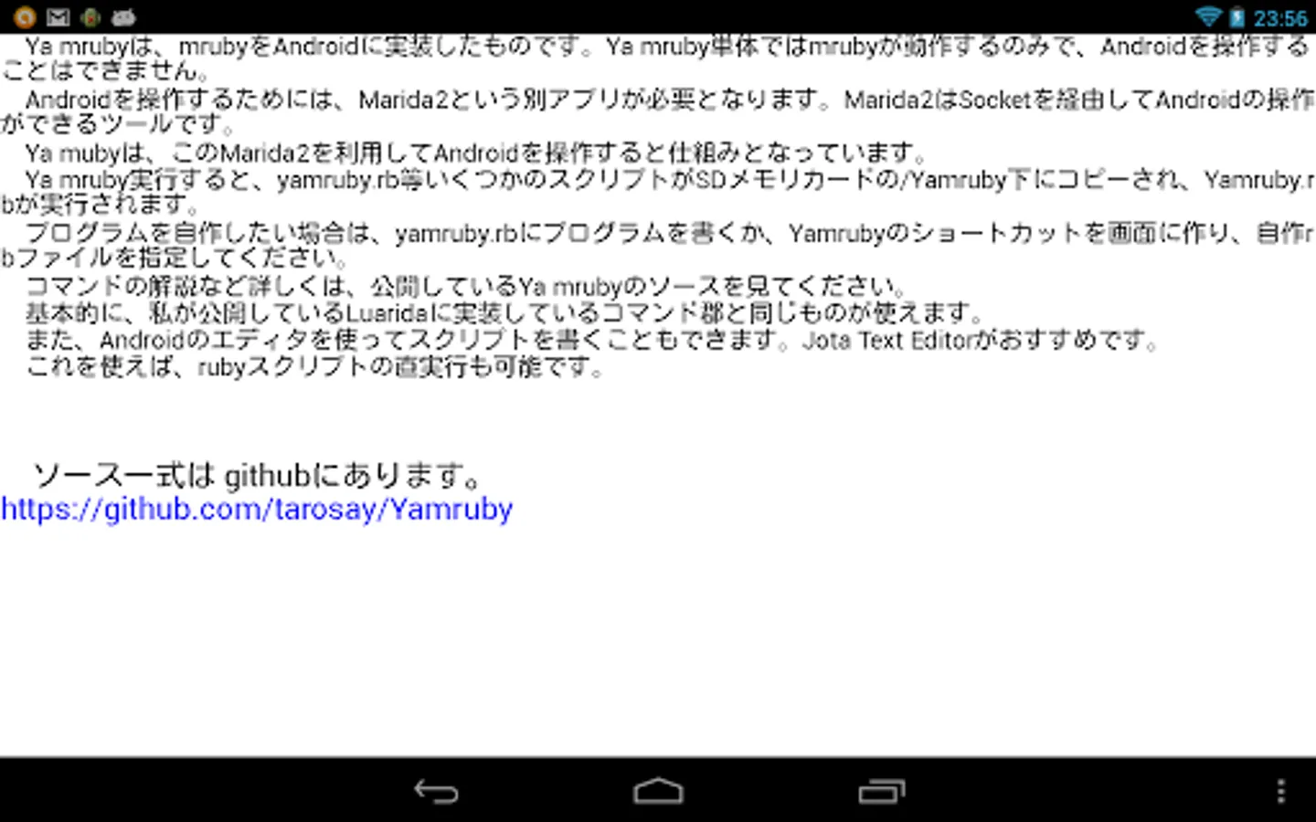 Ya mruby is an implementation on the Android mruby. Ya mruby mruby alone is only works if I can not operate the Android. In order to operate the Android is another app that Marida2 is required. Marida2 is a tool that can be operated via the Android Socket.
