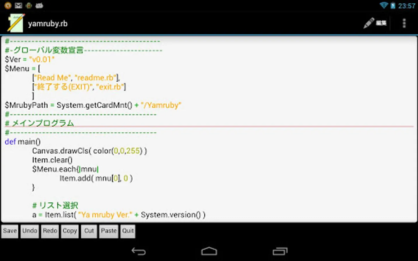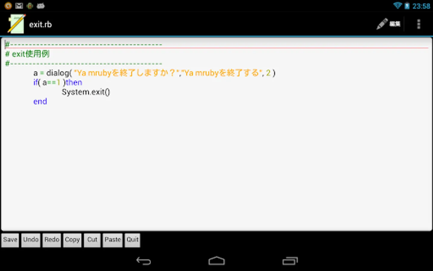 In addition, you can also write a script using the editor of your Android. I recommend Jota Text Editor. With this, you can also run the ruby script directly.