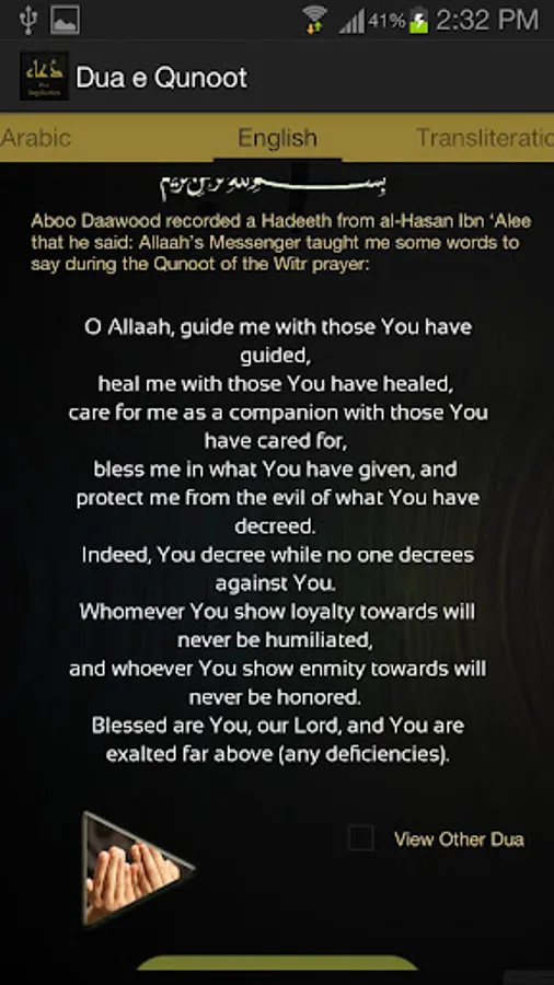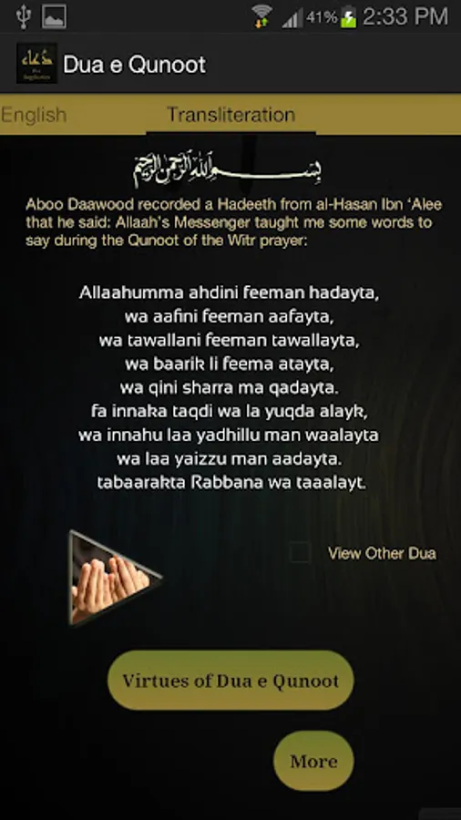 This app helps you read the text of the supplication as well as facilitates you in listening to the Dua e Qunoot. It also contains English Translation and Transliteration.