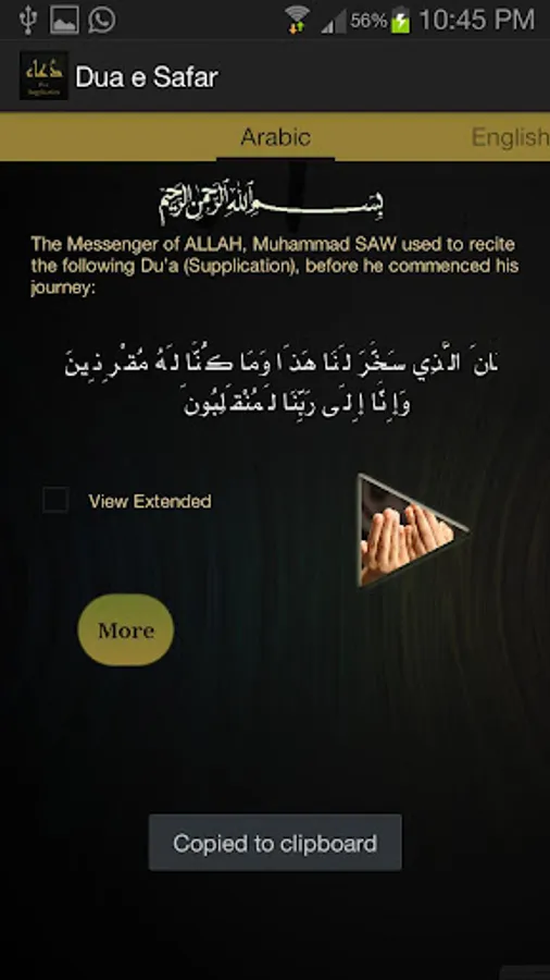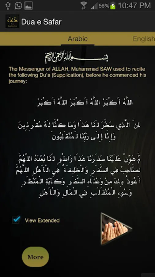 This application helps you listen to the Dua e Safar (Supplication of Travelling) with great ease. It also facilitates you to read the text of the supplication so you understand its meaning. It displays Arabic Text, English Translation and Transliteration.
