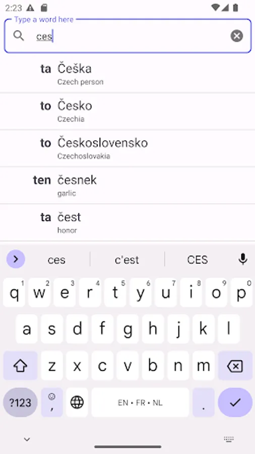 * Search - A quick Search of a noun's gender by just typing the first few letters of the word. With an Internet connection, you can learn more about a selected noun and its practical usage by clicking Show Definition and accessing the Czech Wikislovnik dictionary.