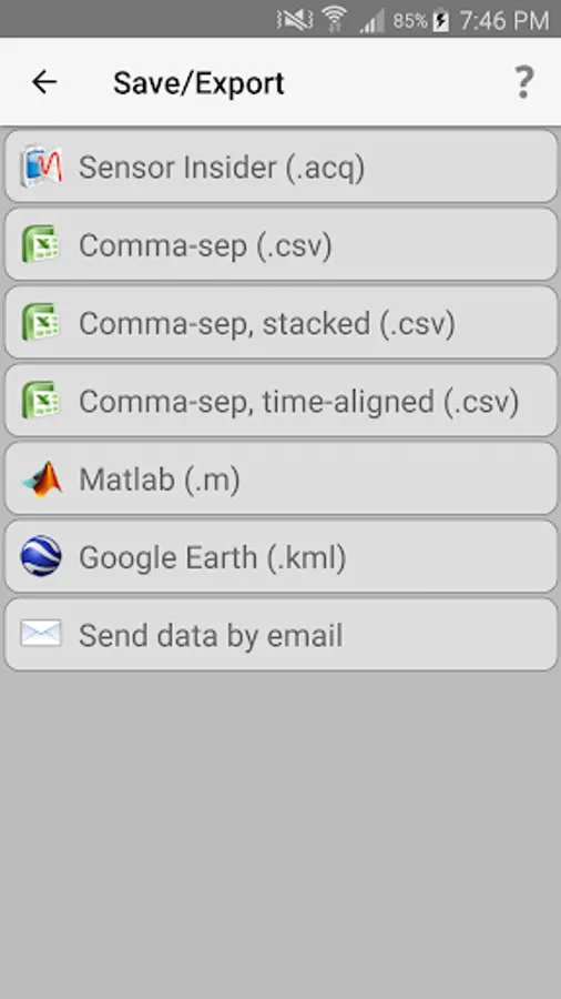 - Export data to file in Matlab, CSV (Excel-compatible), or KML (for Google Earth) format, for further analysis on a computer.