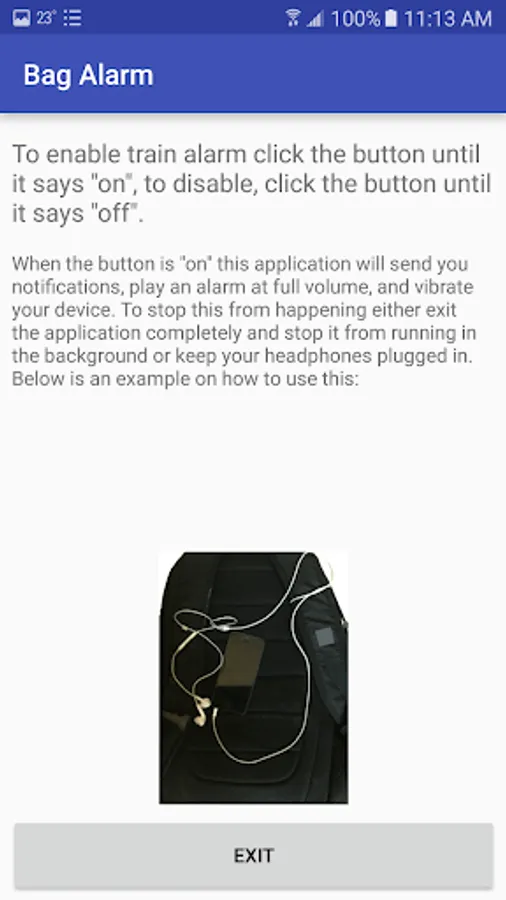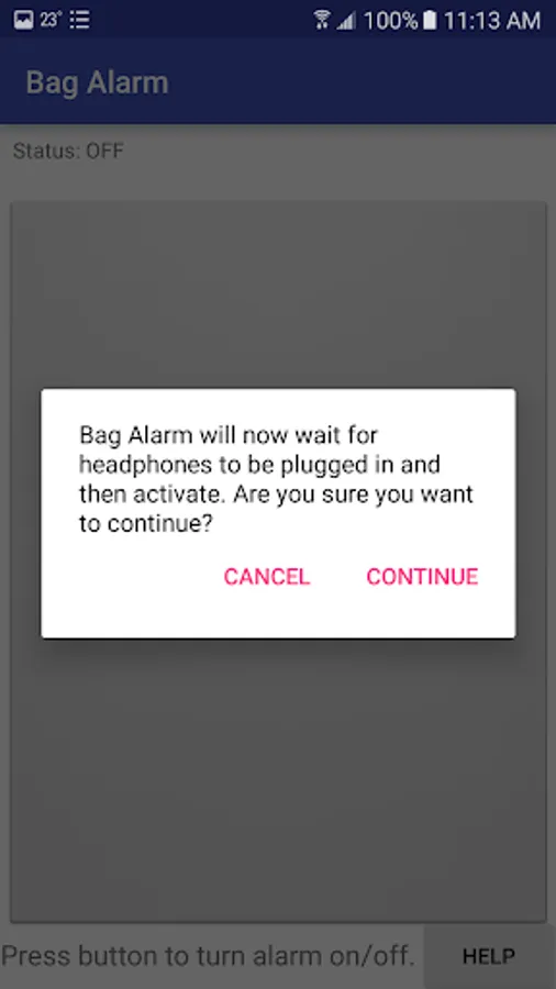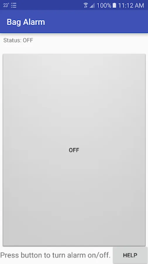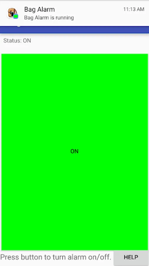 1. Launch the app and enable the alarm by pressing the big grey button. The button will turn green indicating the alarm is armed.