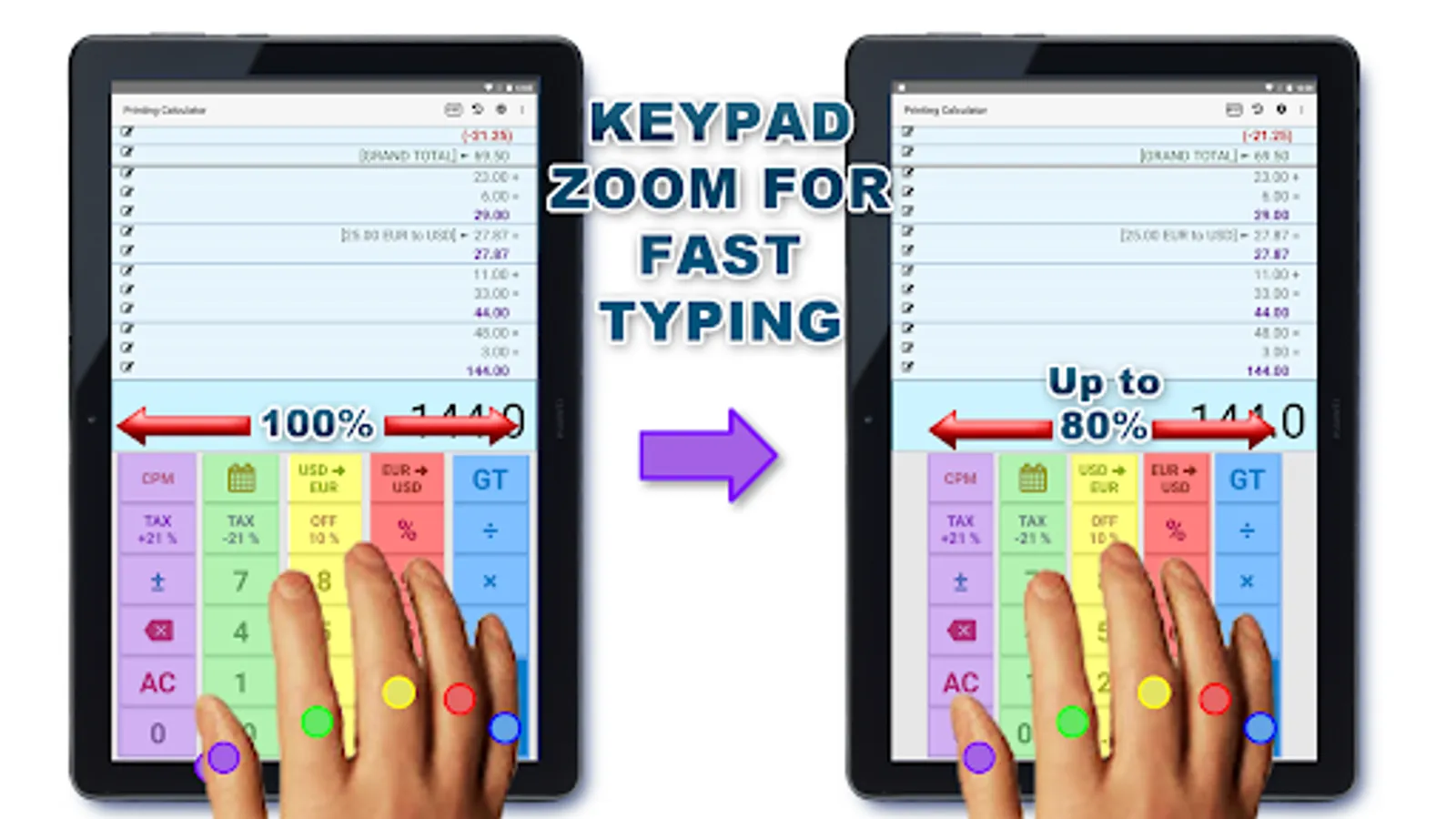 ✅ For large screens (such as 10-inch tablets), this calculator allows the possibility of modifying the width of the keyboard in such a way that the hand fits more naturally to the buttons and thus gains speed.