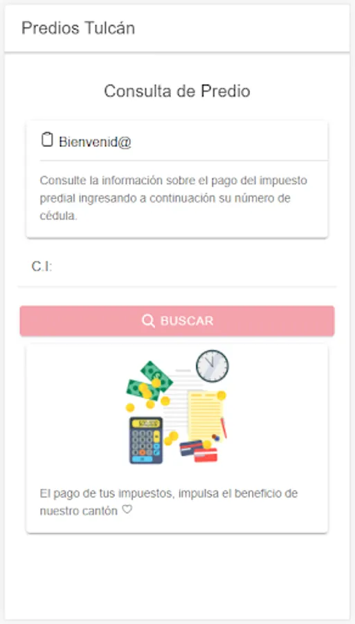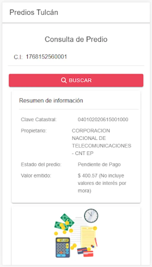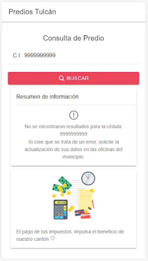 An application that allows you to check the value issued by the GADMT, for the annual urban property tax of the Tulcán canton, Carchi province, in Ecuador. Only with your identity card, you can access the cadastral code, name of the owner, state of the property and the value issued for the last year. You can also view a graph with a history of up to 3 years for the consulted property; all in order to inform you about your payment status and your credentials, in case of claims.