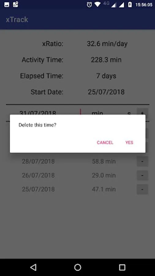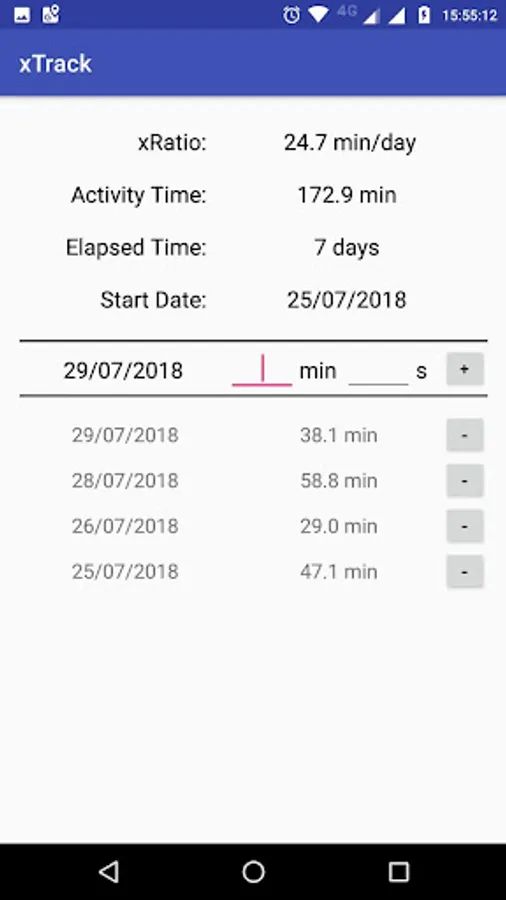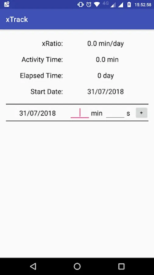 Keeps track of your daily exercises times! It's a simple database. No GPS. No Clock. No Accelerometer. No Internet. No Camera. Just enter two data after your daily exercises: 1) The day; 2) The total time of your exercise on that day. Try to keep your xRatio on the level you consider prudent.