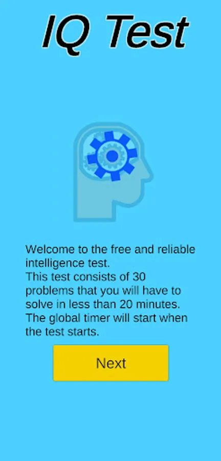 With this simple and free application, you will be able to know your level of intelligence and calculate your IQ easily and simply. You will only have to solve 30 problems in a maximum time of 20 minutes.