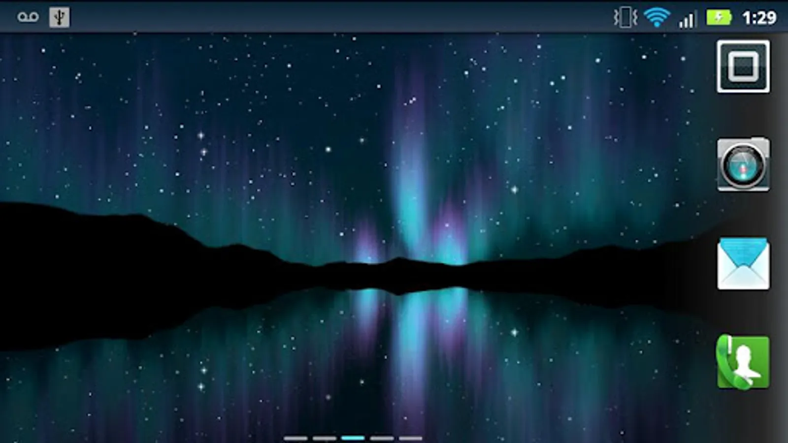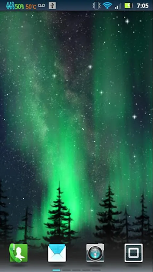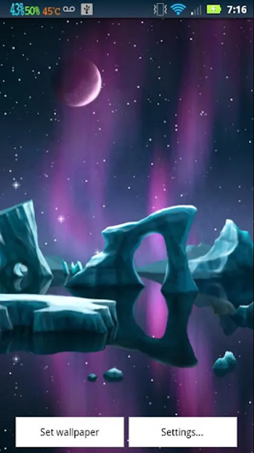 Can't find time to go see the Northern Lights? Now you can watch them on your phone! Northern Lights live wallpaper creates a real-time simulation of the Northern Lights, also known as the Aurora Borealis. Stars twinkle slowly in the background while the lights dance, and the pattern never repeats. The full version lets you select several different locations to watch the lights from, and allows you to choose from six different light color themes.