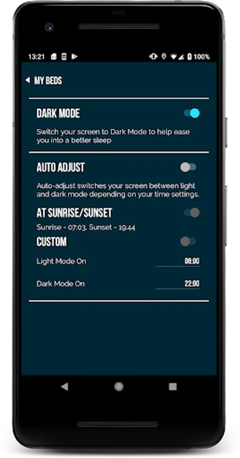 - Screen settings include dark mode and auto adjust with sunrise-sunset option when location permissions are allowed