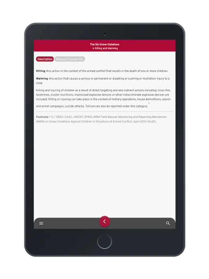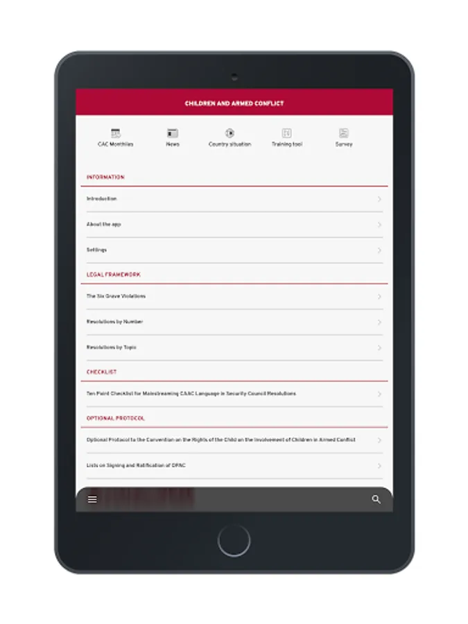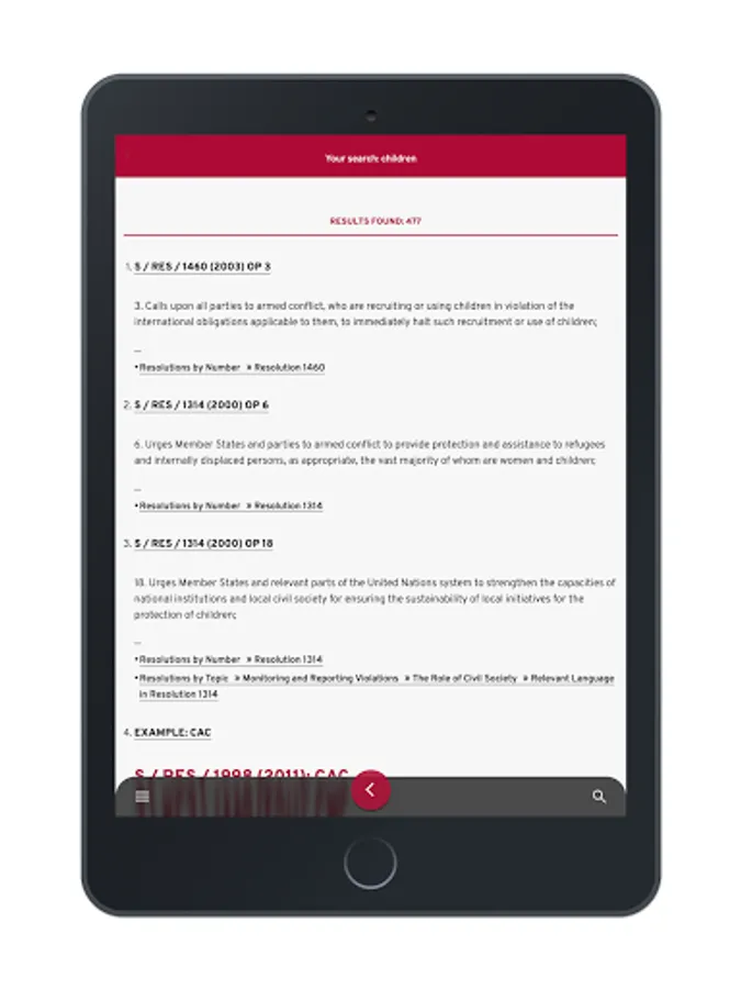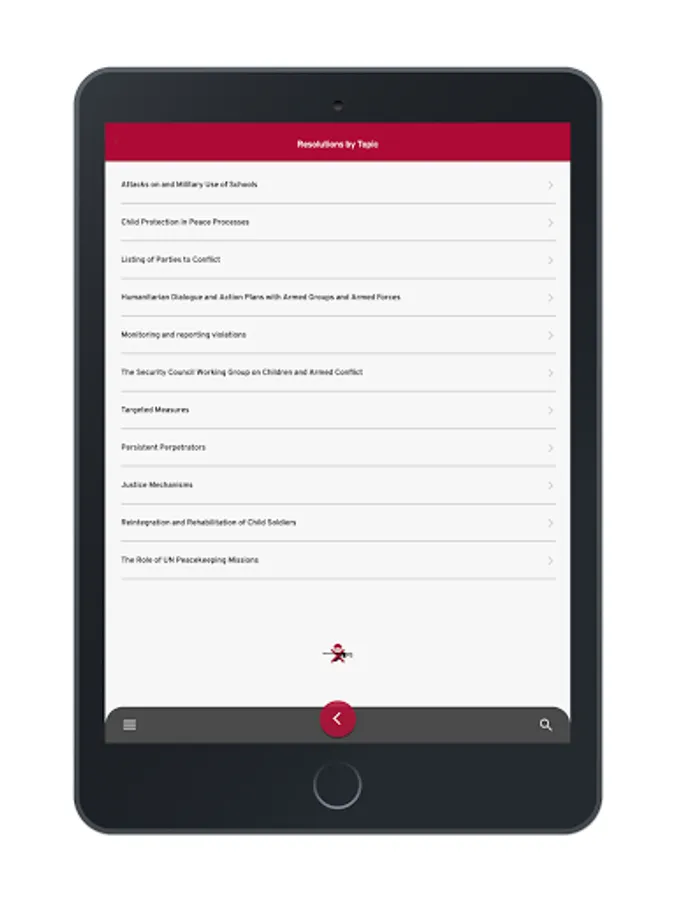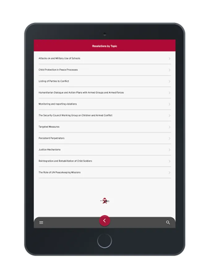 This application seeks to ensure that the important progress achieved within the UN’s Children and Armed Conflict agenda translates into the negotiations of the Security Council’s country-specific and thematic resolutions. With this application we aim to provide policy-makers and those seeking to influence them with readily available key documents and appropriate language on child protection issues in order to increase the agenda’s impact. The application additionally offers guidance to field-based child protection practitioners responsible for monitoring and reporting on grave violations via an interactive training tool on attacks schools and hospitals.