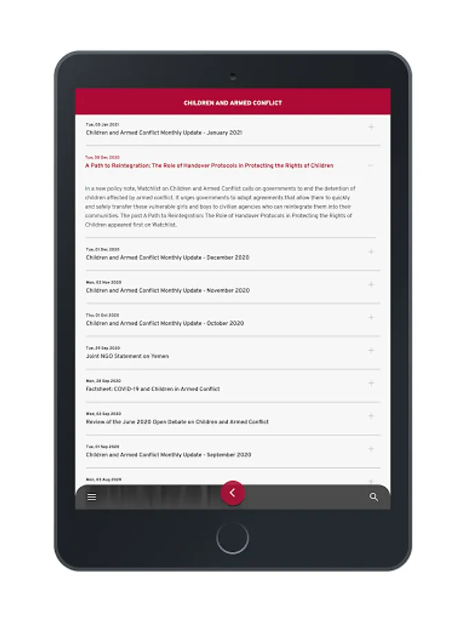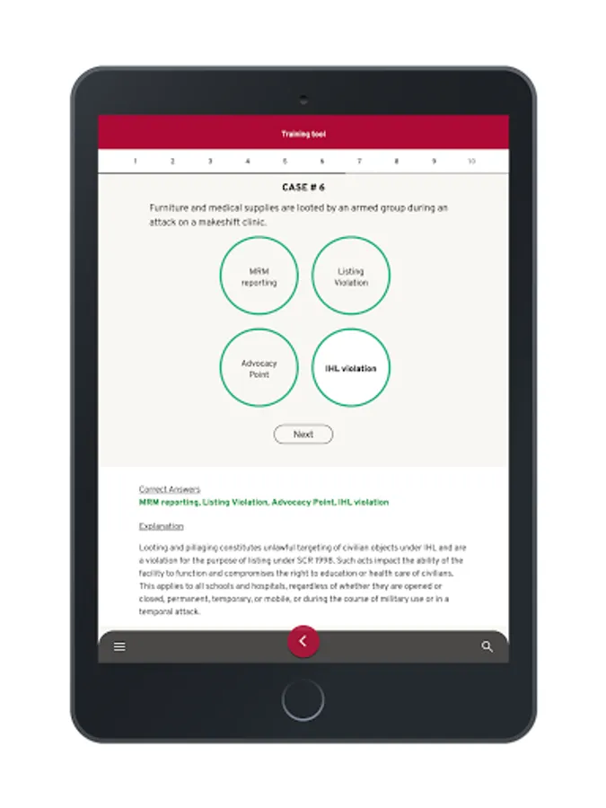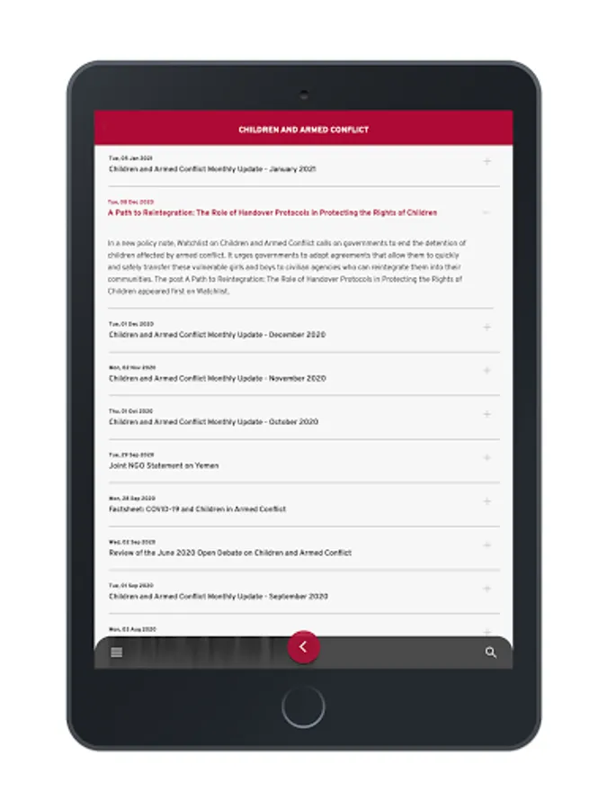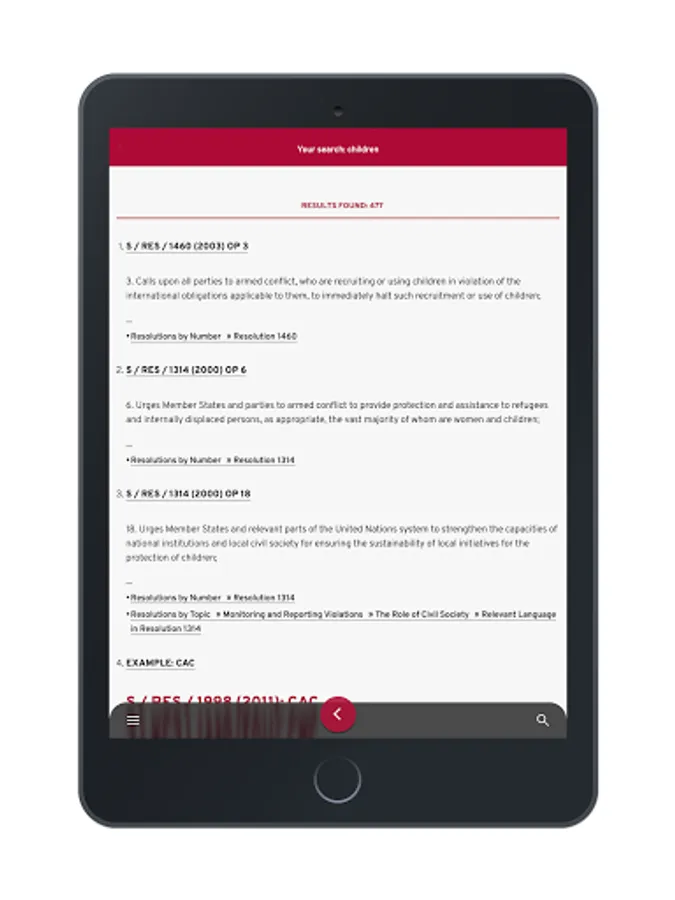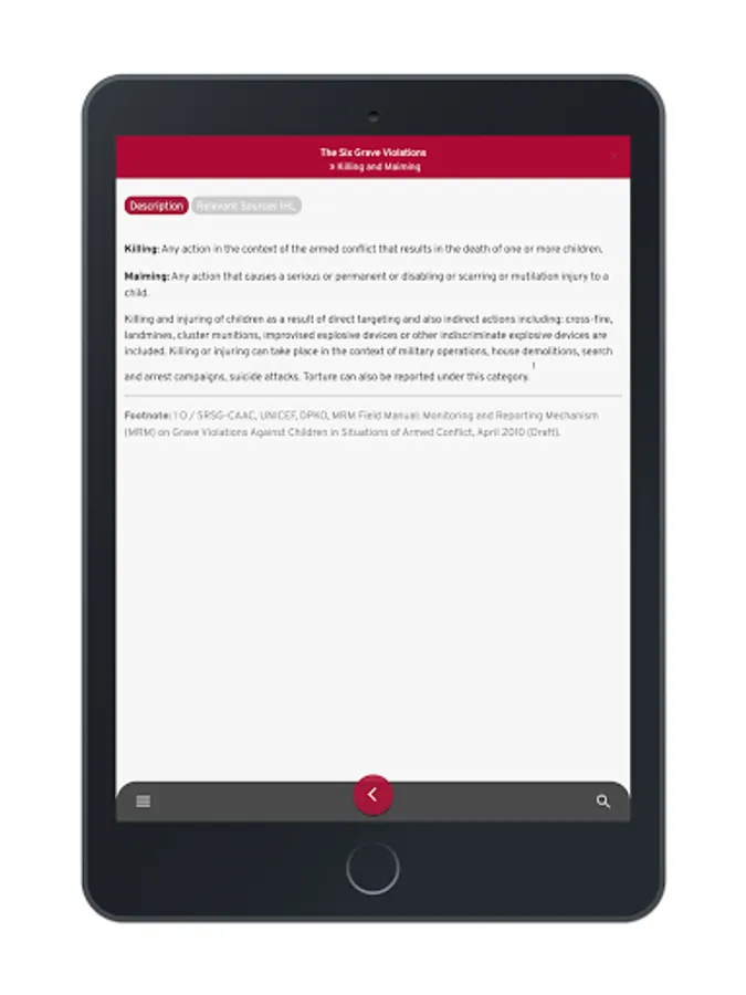 This application seeks to ensure that the important progress achieved within the UN’s Children and Armed Conflict agenda translates into the negotiations of the Security Council’s country-specific and thematic resolutions. With this application we aim to provide policy-makers and those seeking to influence them with readily available key documents and appropriate language on child protection issues in order to increase the agenda’s impact. The application additionally offers guidance to field-based child protection practitioners responsible for monitoring and reporting on grave violations via an interactive training tool on attacks schools and hospitals.