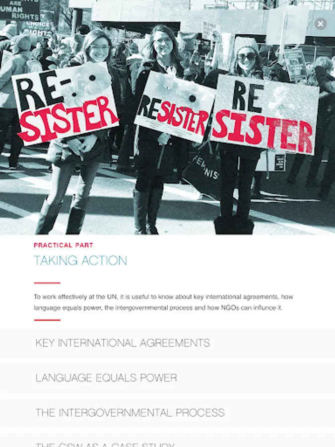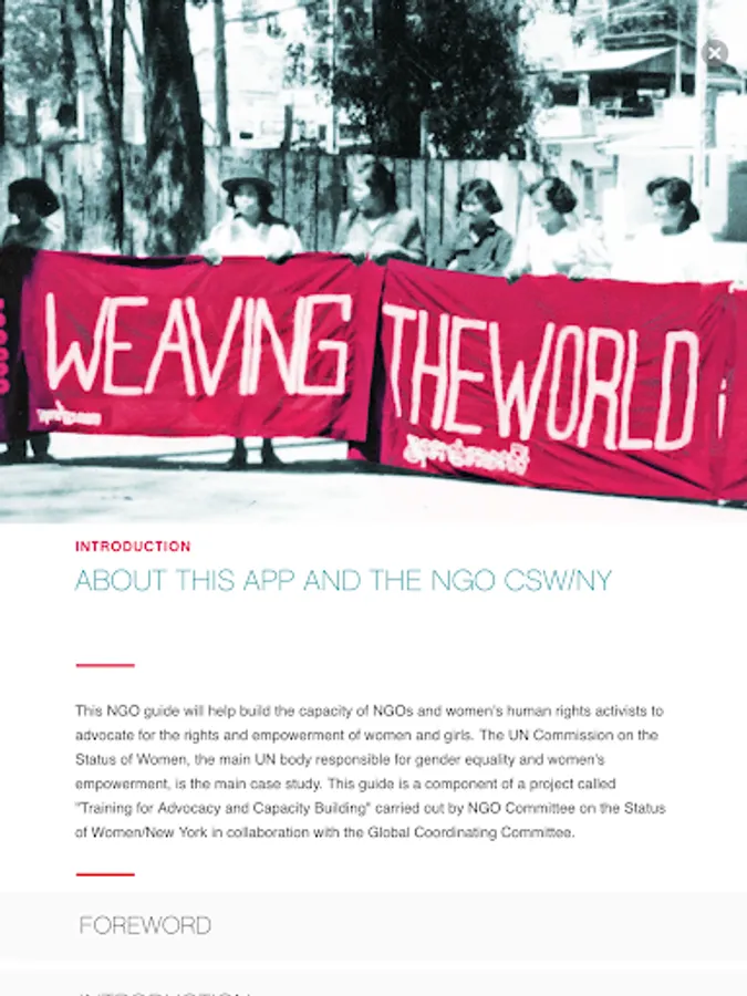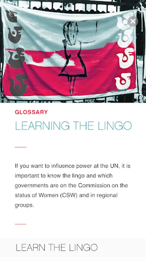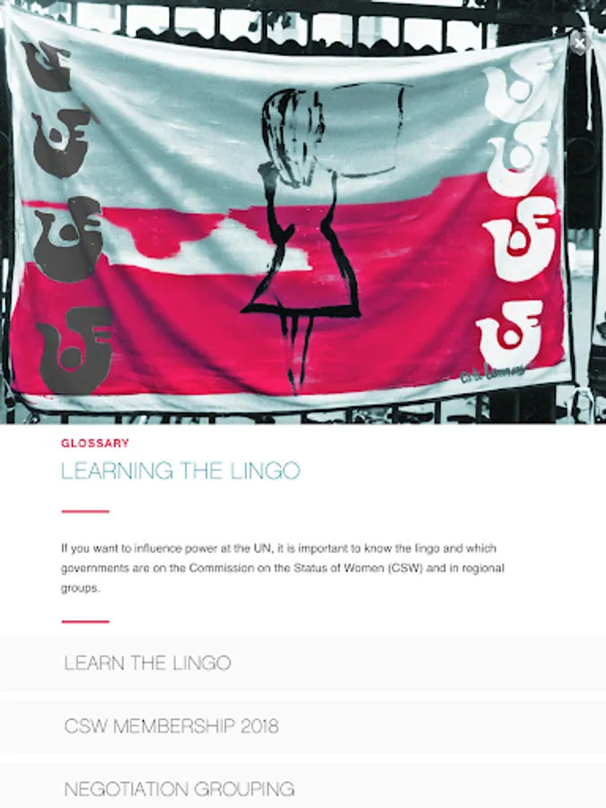 Language equals power at the UN. This Guide introduces you to the tools and knowledge you need to advocate at the UN. This app is based on the online printable booklet entitled " A Guide for NGOs and Women's Human Rights Activists at the UN and CSW". It is a training, educational tool and quick reference. The case study is the UN Commission on the Status of Women that oversees the implementation of gender equality and women's human rights policies in 193 countries.