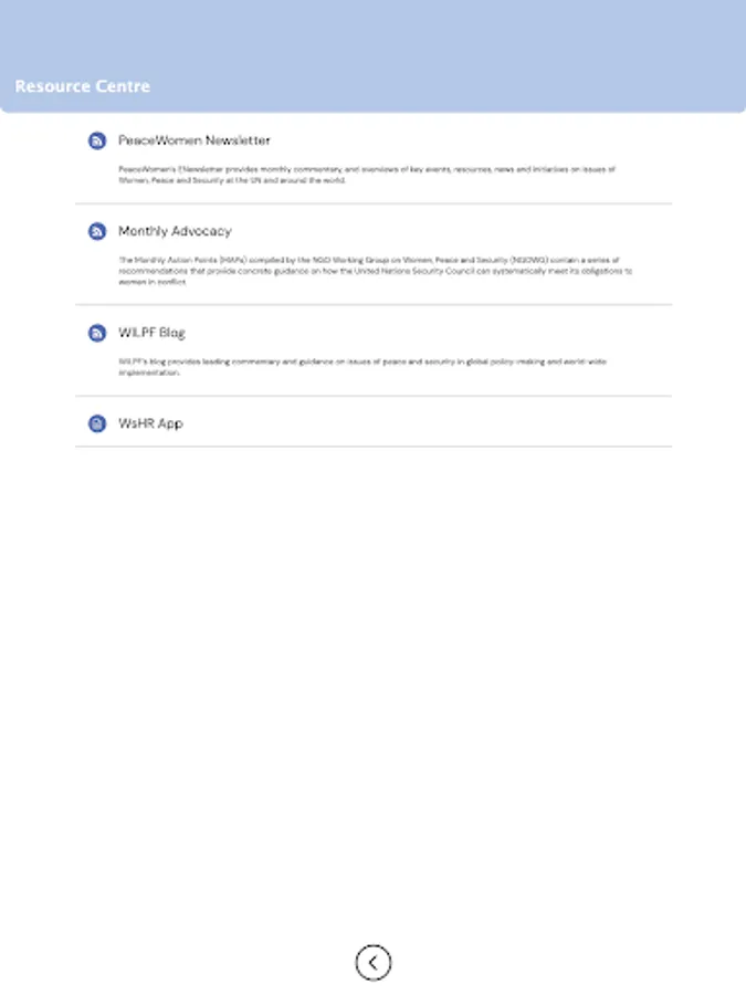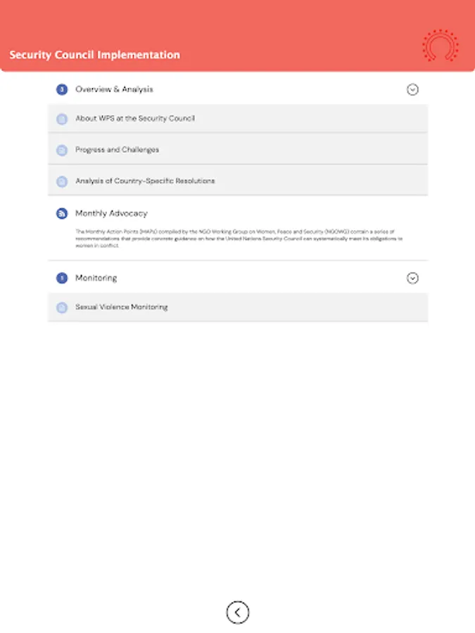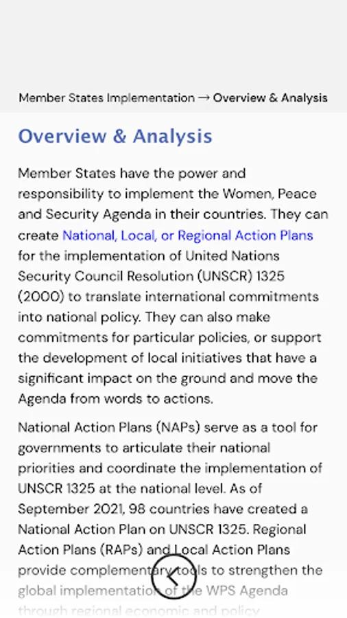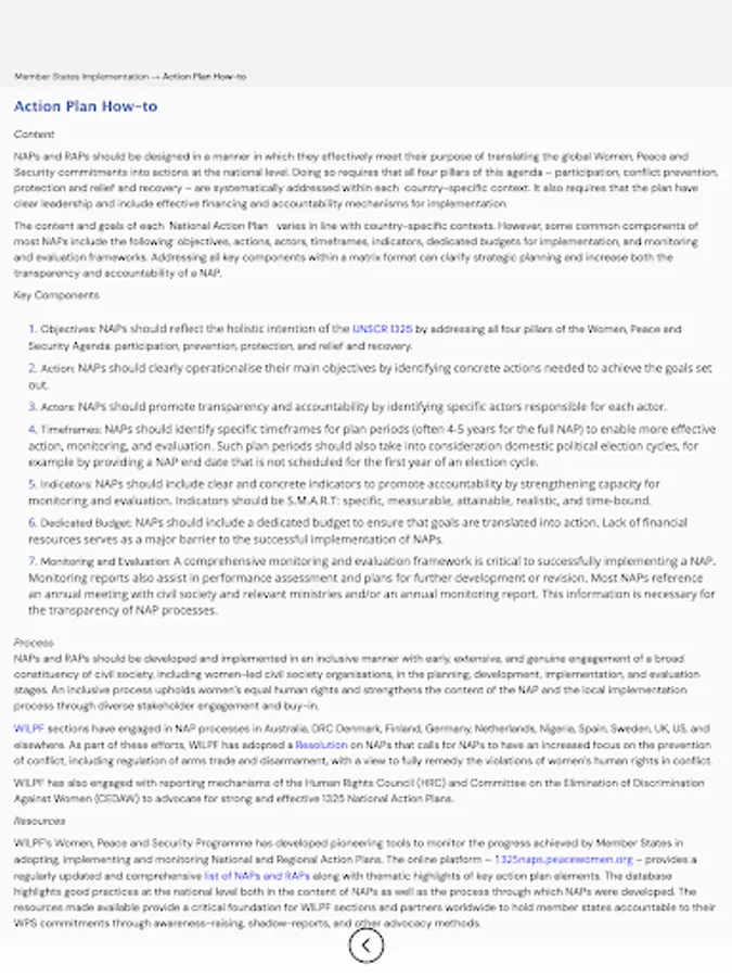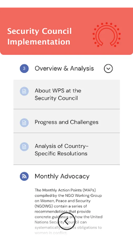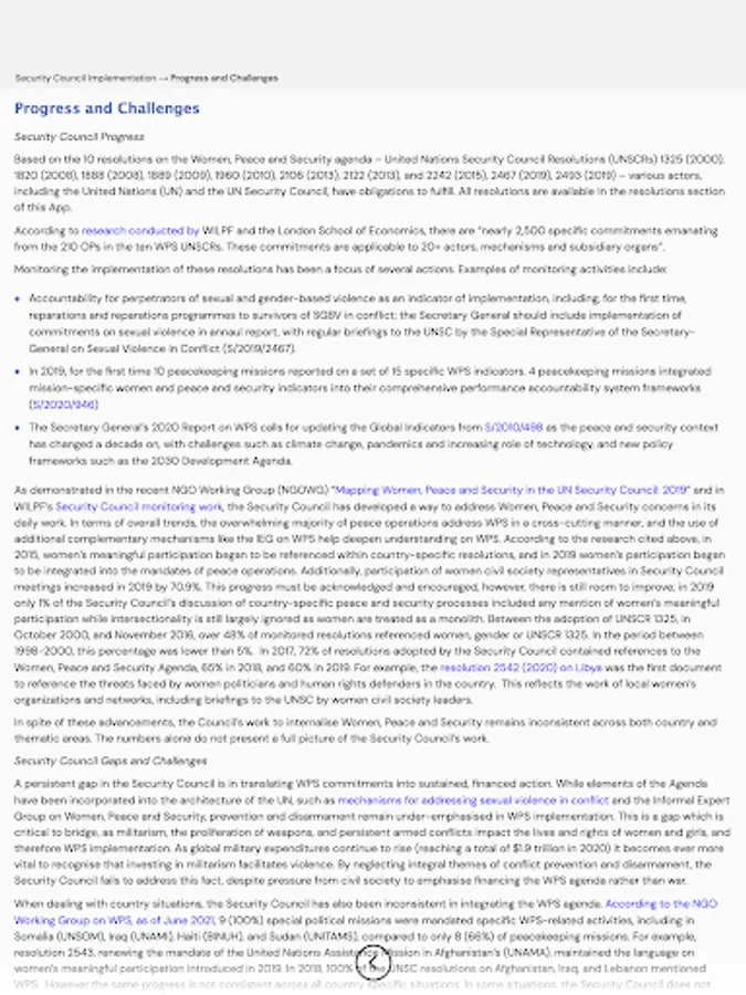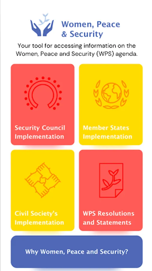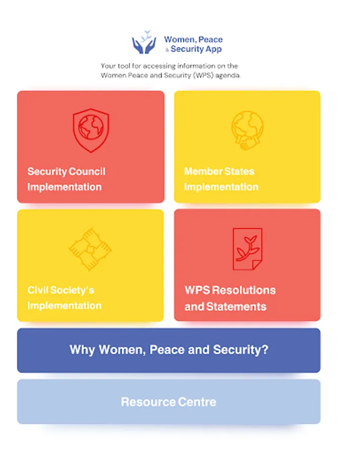 This app is a tool for accessing information on the Women, Peace and Security (WPS) agenda. It is designed for policy-makers, practitioners, academics, advocates, and activists to easily access on-the-go information about WPS implementation at multiple levels. It has six main sections: Security Council Implementation, Member States Implementation, Civil Society Implementation, Resolutions and Presidential Statements, Why Women, Peace and Security, and a Resource Centre.