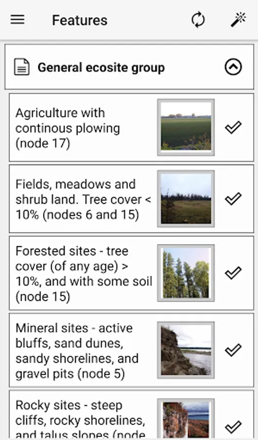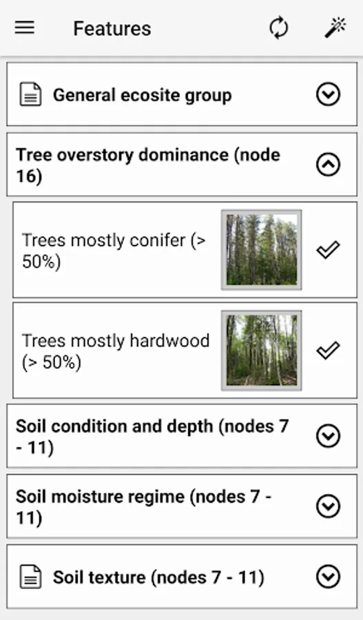 The identification keys are not a traditional dichotomous key, but rather work by selecting features that describe the ecosite. Selections may add or remove additional questions. As you enter feature information the list of remaining possible ecosites are filtered. Eventually you are left with only one or two choices.