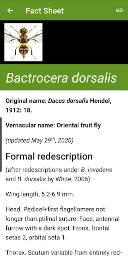 The key contains characters to differentiate between adults of 29 fruit fly species of the subfamily Dacinae, that are considered of economic significance to the agriculture and horticulture in Sub-Sahara Africa. This key is composed within the framework of the STDF (Standards and Trade Development Facility) project F³ Fruit Fly Free: Establishment and maintenance of fruit production areas free and under low prevalence of fruit fly pests in southern Africa. It includes all major pest species of the genera Bactrocera, Ceratitis, Dacus, Trirhithrum and Zeugodacus regularly encountered in surveying, detection and pest control activities. The key provides subsets of species for different geographic regions on the continent (western, central, eastern, southern Africa) as well as the islands of the Western Indian Ocean. In addition, for each species a condensed datasheet is provided with the basic information regarding morphology, biology, host range, distribution, impact and management. Also, links to more extended information sources have been included for each species.