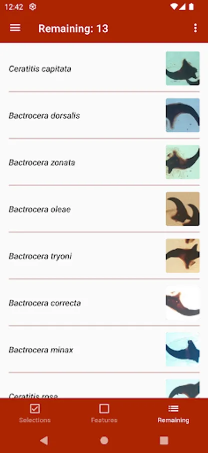 The key contains characters to differentiate between adults of 12 fruit fly species of the subfamily Dacinae, that are considered of quarantine significance. The short list of 12 species includes the target fruit flies (Ceratitis capitata, C. rosa, C.quilicii, Bactrocera dorsalis, B. zonata and Zeugodacus cucurbitae) and a number of species closely related to these. It was composed after consultation with different potential end-users (NPPOs, the European Reference Laboratories for Insects and Mites, EPPO). In addition, for each species a condensed datasheet is provided with the basic information regarding morphology.