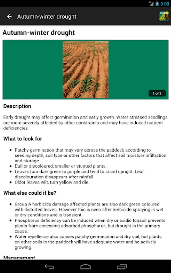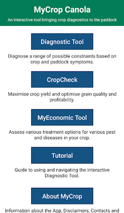 The Diagnostic Tool quickly diagnoses a range of possible constraints based on real-time crop and paddock symptoms. It contains an extensive image and factsheet library for 70 in-crop canola constraints - helping you to accurately identify constraints and determine possible management solutions. Covering a broad range of diseases, pests, nutrient deficiencies, herbicide damage symptoms and other management and environmental production issues it is bound to be a helpful tool in the paddock.