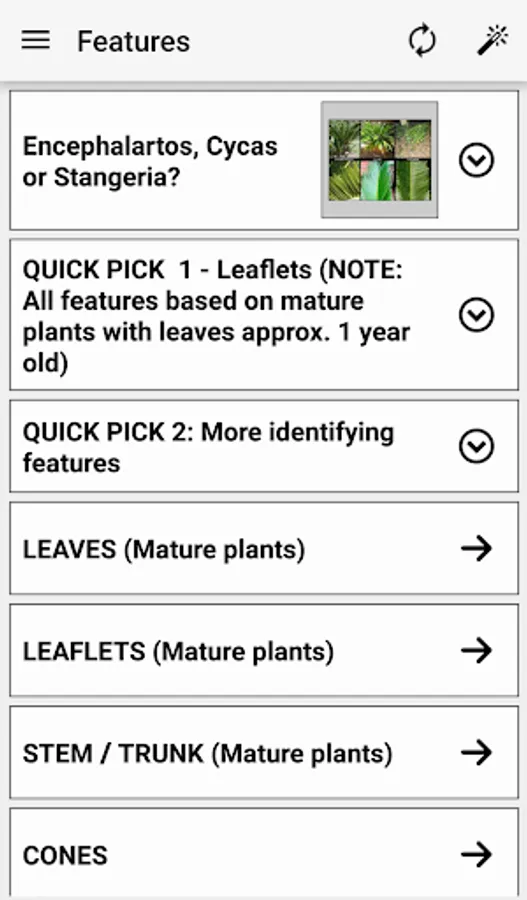 This free mobile app is designed to lead you through a series of interactive steps, using photographs and easily observable features, to assist you with the quick identification of cycads. The tool also includes fact sheets containing important information such as conservation status, identifying features, geographic location as well as similar-looking species. Please note that the tool is not designed to aid in identification of cycad seedlings.