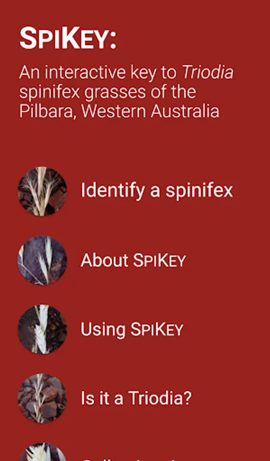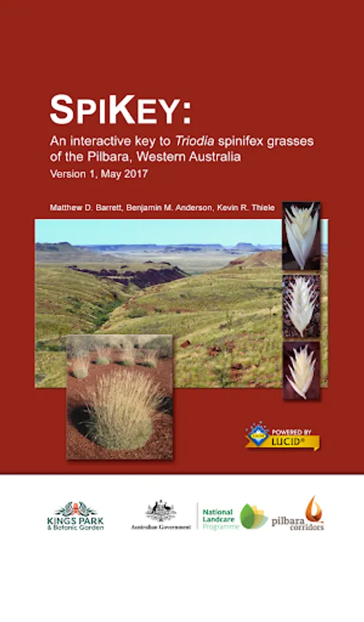 SPIKEY: An interactive key to Triodia spinifex grasses of the Pilbara, Western Australia is an interactive identification tool covering all of the hummock grasses (the genus Triodia) colloquially known as ‘spinifex’ that occur in the Pilbara bioregion and adjacent areas of Western Australia. This key covers a total of 28 species and one hybrid, about one-quarter of the species in the genus Triodia, using 28 features. This is an important update; about half of the species treated are recently described, and are not covered by earlier synopses of Triodia. Triodia are the dominant plants and a major restoration target in arid zone hummock grasslands, an ecosystem covering 18% of Australia, and correct identification is critical to successful restoration and rehabilitation. This app is intended to be used by land managers, rehabilitation practitioners, botanical consultants, seed collectors, identification botanists and anyone curious about Triodia.