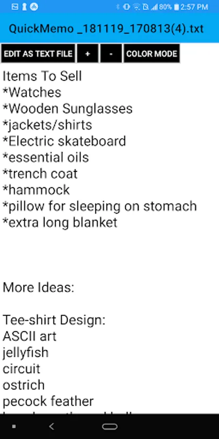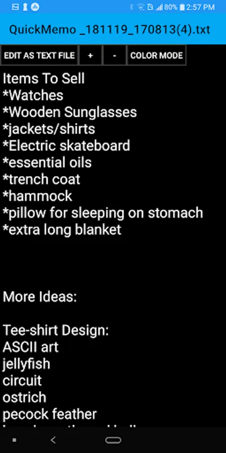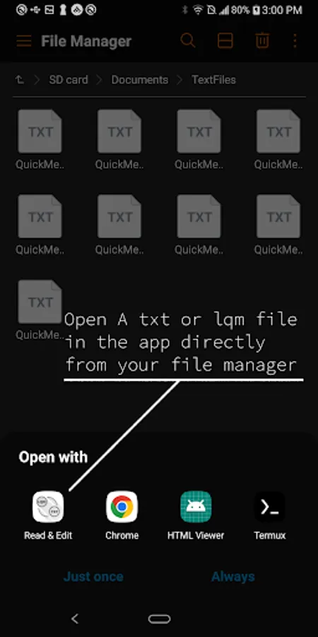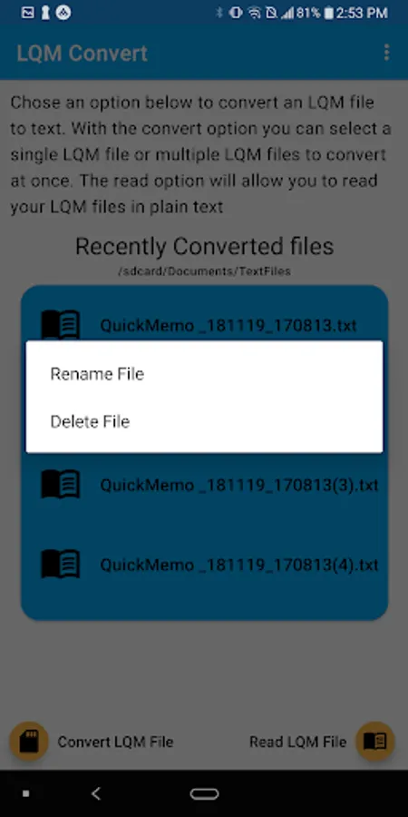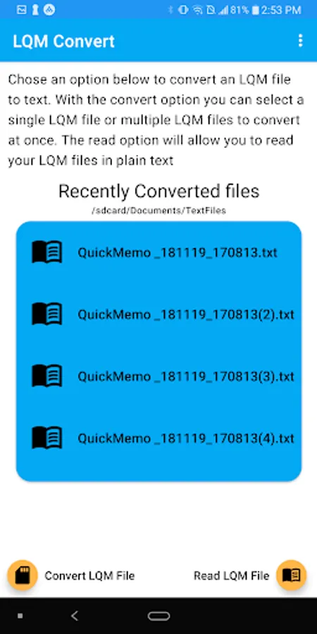 The LQM to Text Converter allows you to convert your backed up .lqm files from LG's QuickMemo app into a plain text file (.txt). This easy to use app lets you select one or multiple LQM files to convert at once to be stored in a folder of your choice. Or you can use it simply to read LQM or TXT files. This app will also allow you to directly view your LQM files when clicked from your system file manager. Now you have the ability to open LQM files on any device. Not only that, but you can also edit the converted text file or any text file on your device with an easy to use text editor.