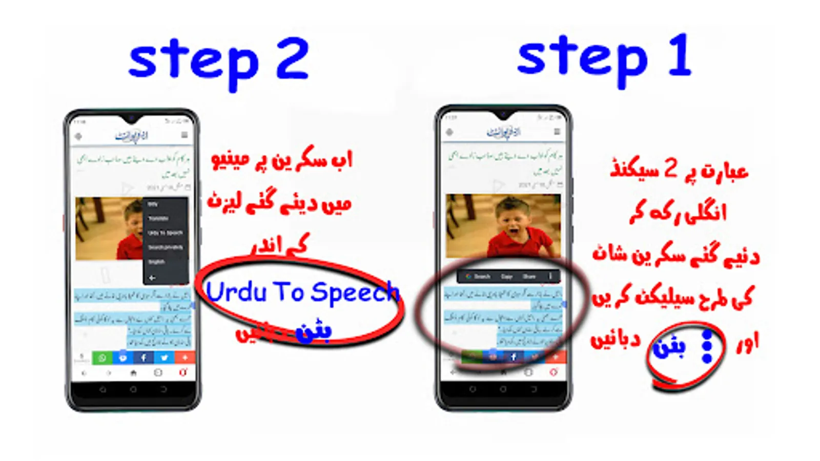 4: Open any app and select a text and an option menu should appear saying (Copy, Select All etc.), in that menu, click on the 3 dots(options) button to see "Urdu To Speech" button and click on that.