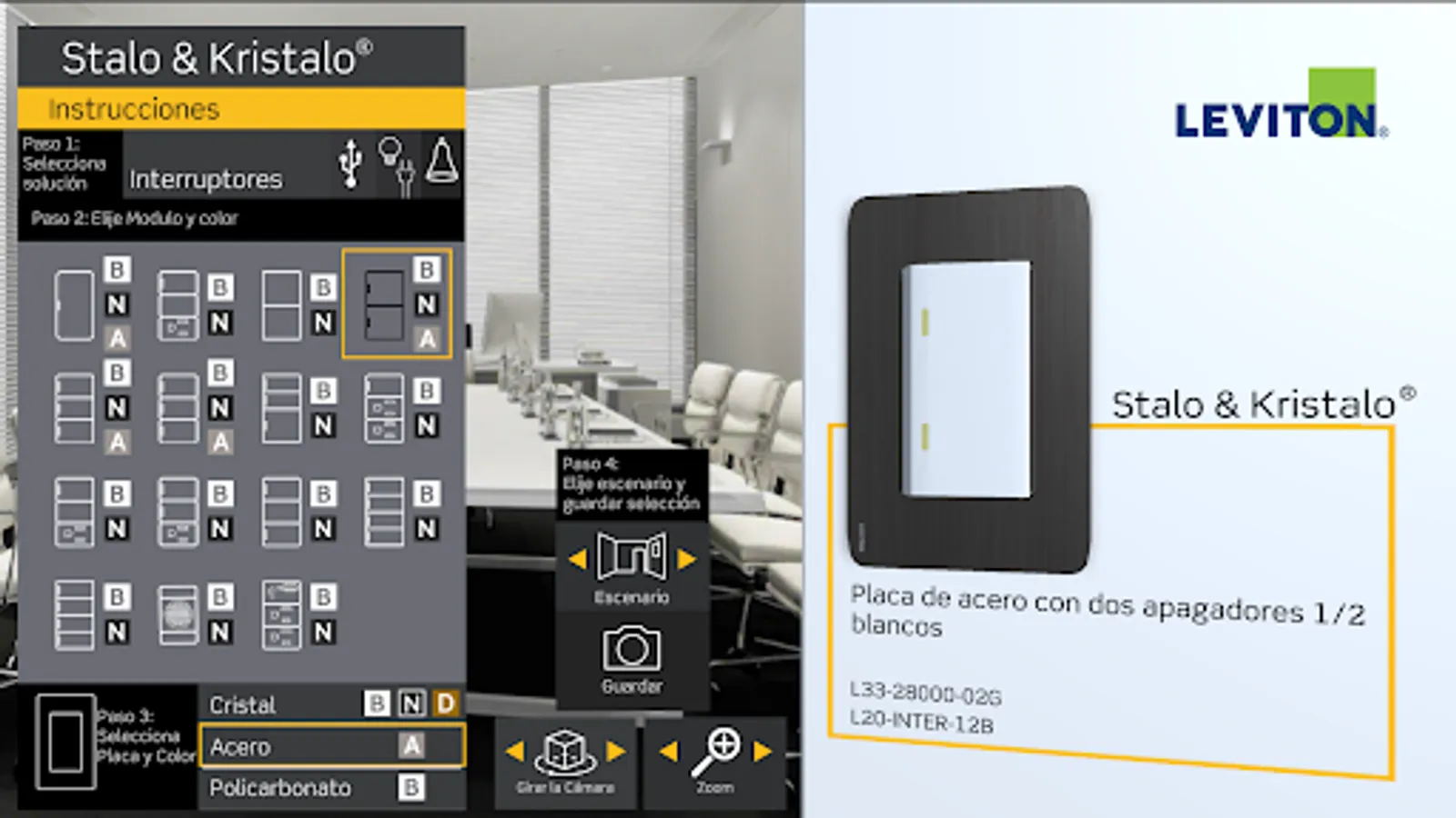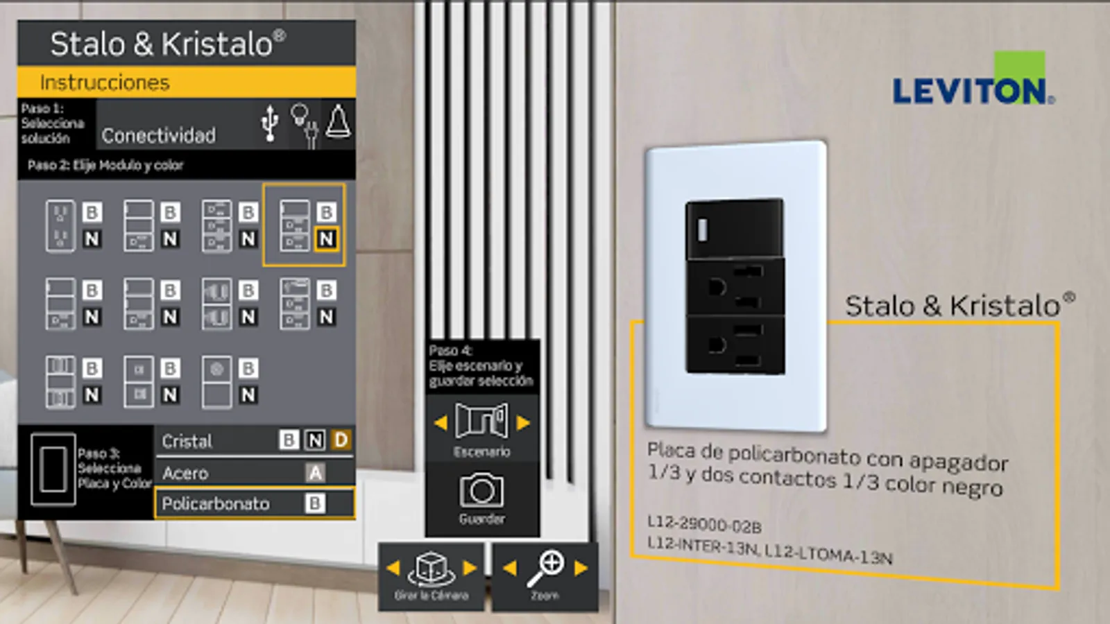 In this app you will be in virtual environments, where you can choose from a catalog the different Leviton products and be able to see how they would look in different environments.